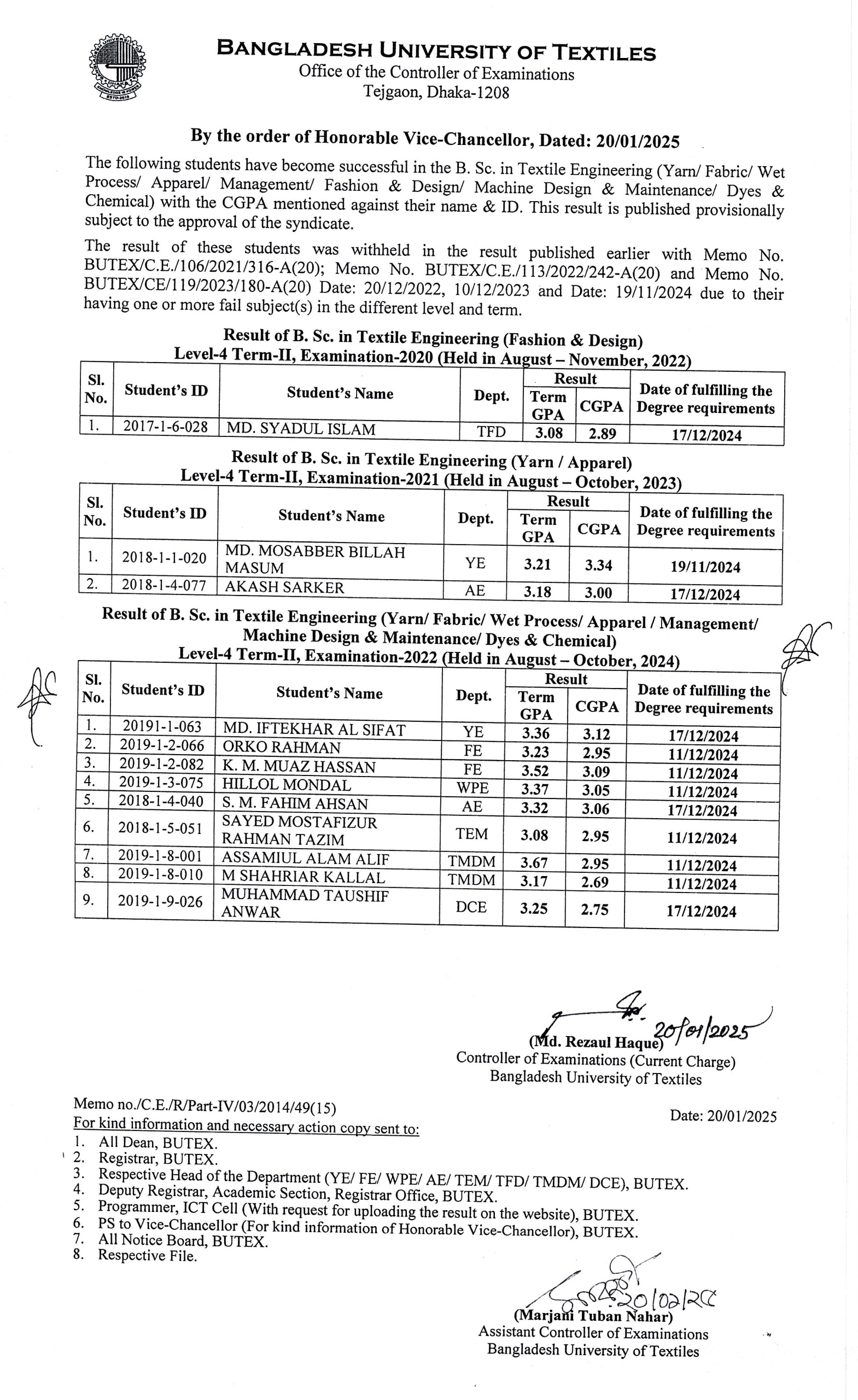 Withheld Result of BSc in Textile Engineering L-4 T-2 Dated: 20-01-2025