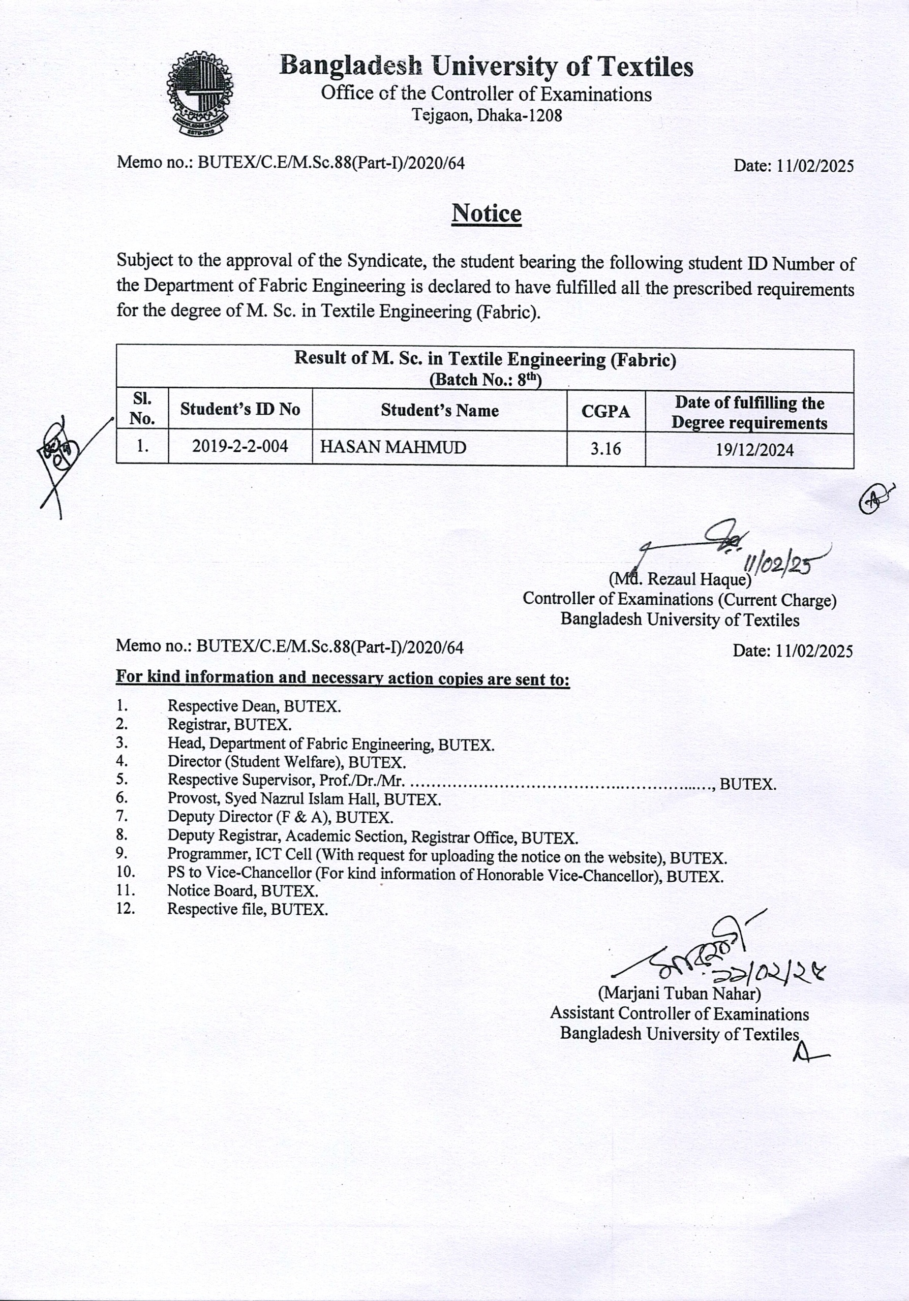 Result of MSc in Textile Engineering (Fabric) 8th Batch