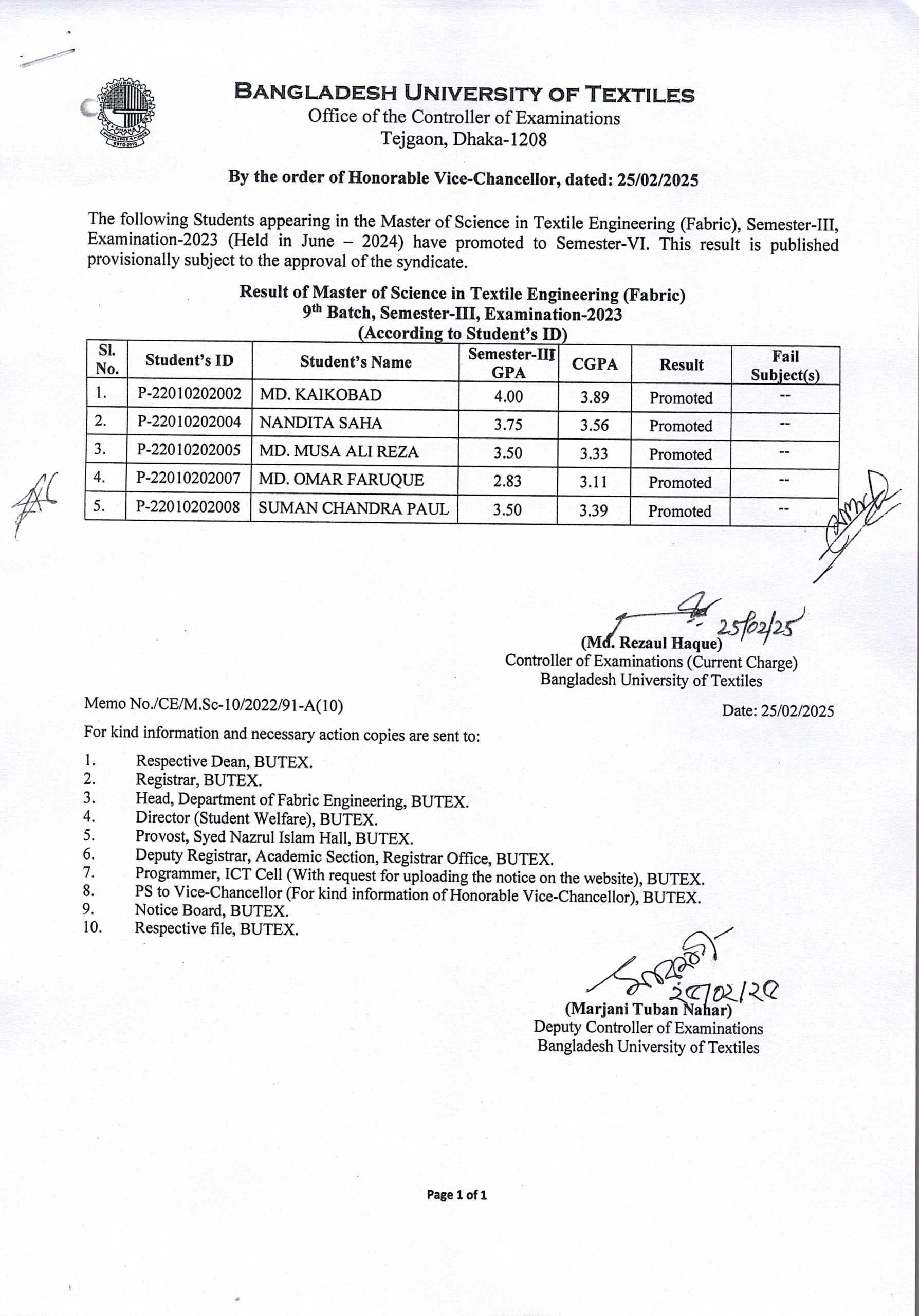 Result of MSc in Textile Engineering (Fabric) 9th Batch 3rd Semester