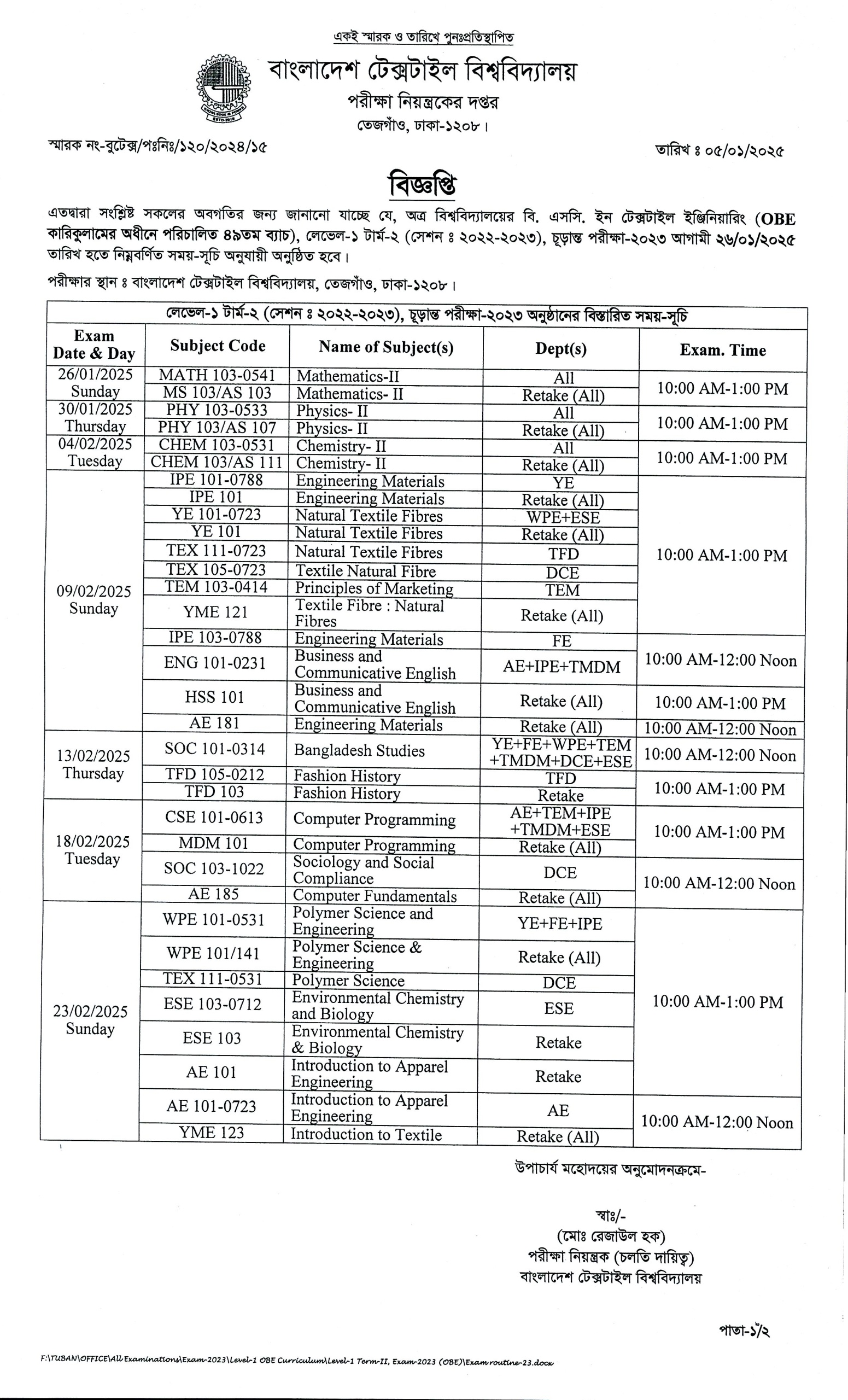 Exam Schedule: BSc in Textile Engineering L-1 T-2 Exam-2023