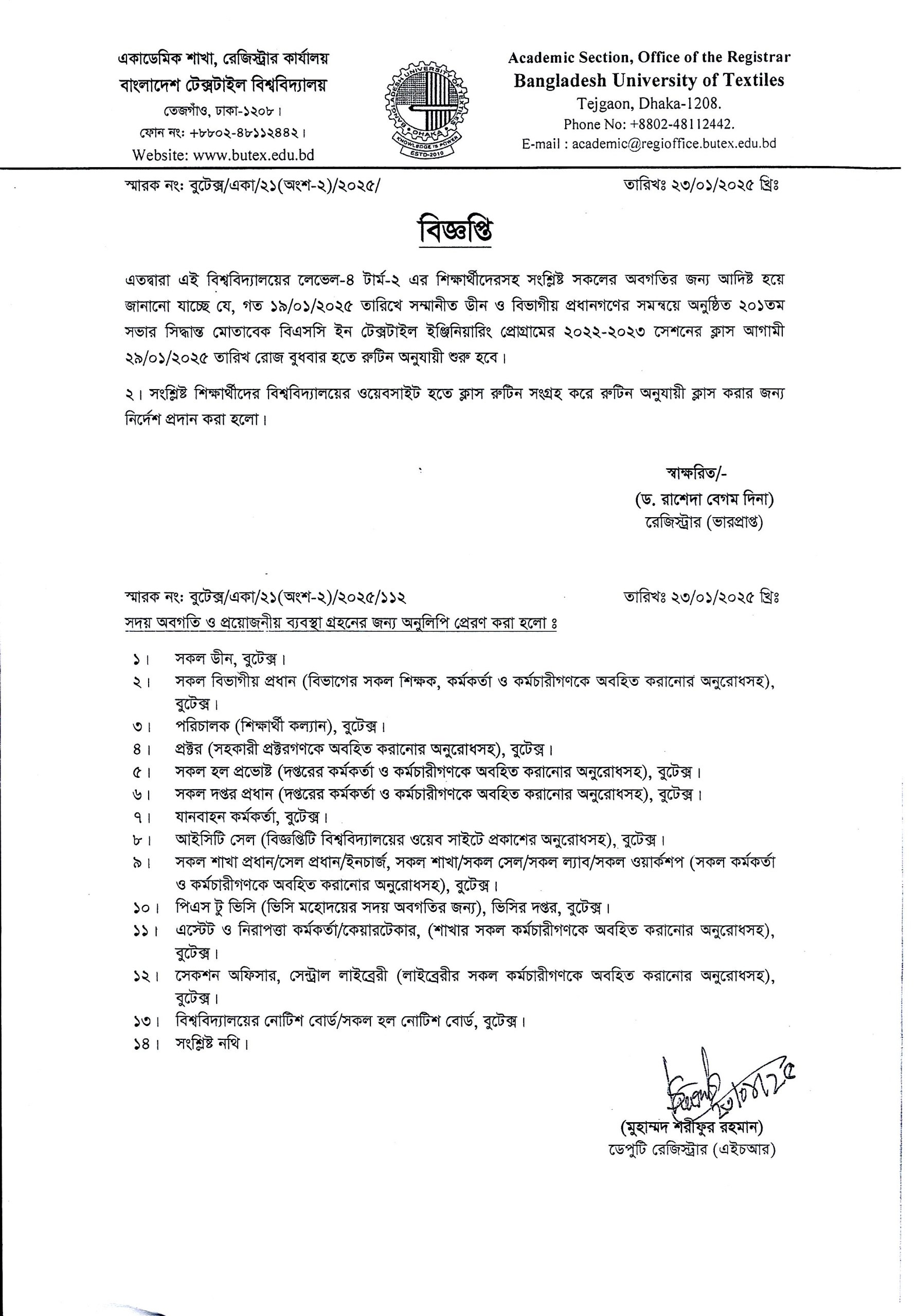 BSc in Textile Engineering L-4 T-2 Classes to Begin from 29/01/2025