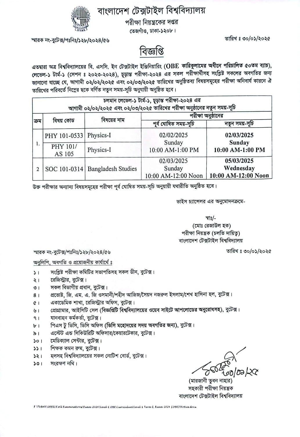 Exam Reschedule Notice of BSc in Textile Engineering L1-T1 (50 Batch)