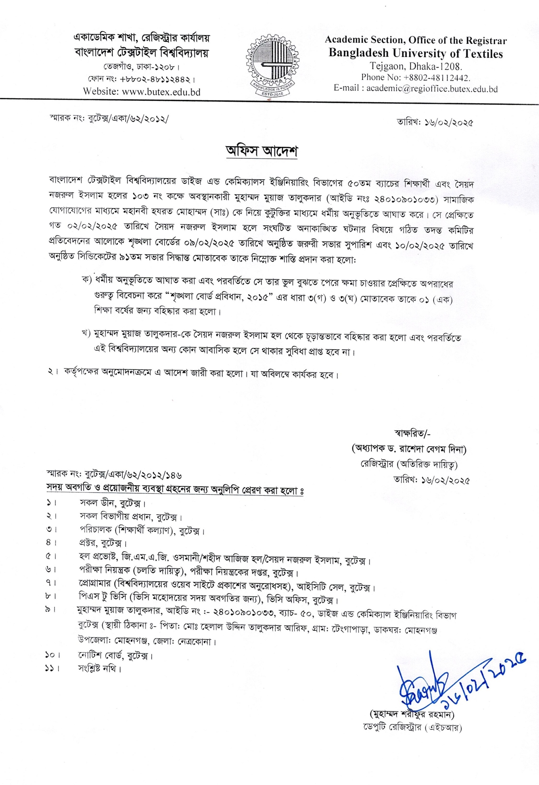 Disciplinary Notice: BSc in Textile Engineering 50 Batch (ID: 24010901033)
