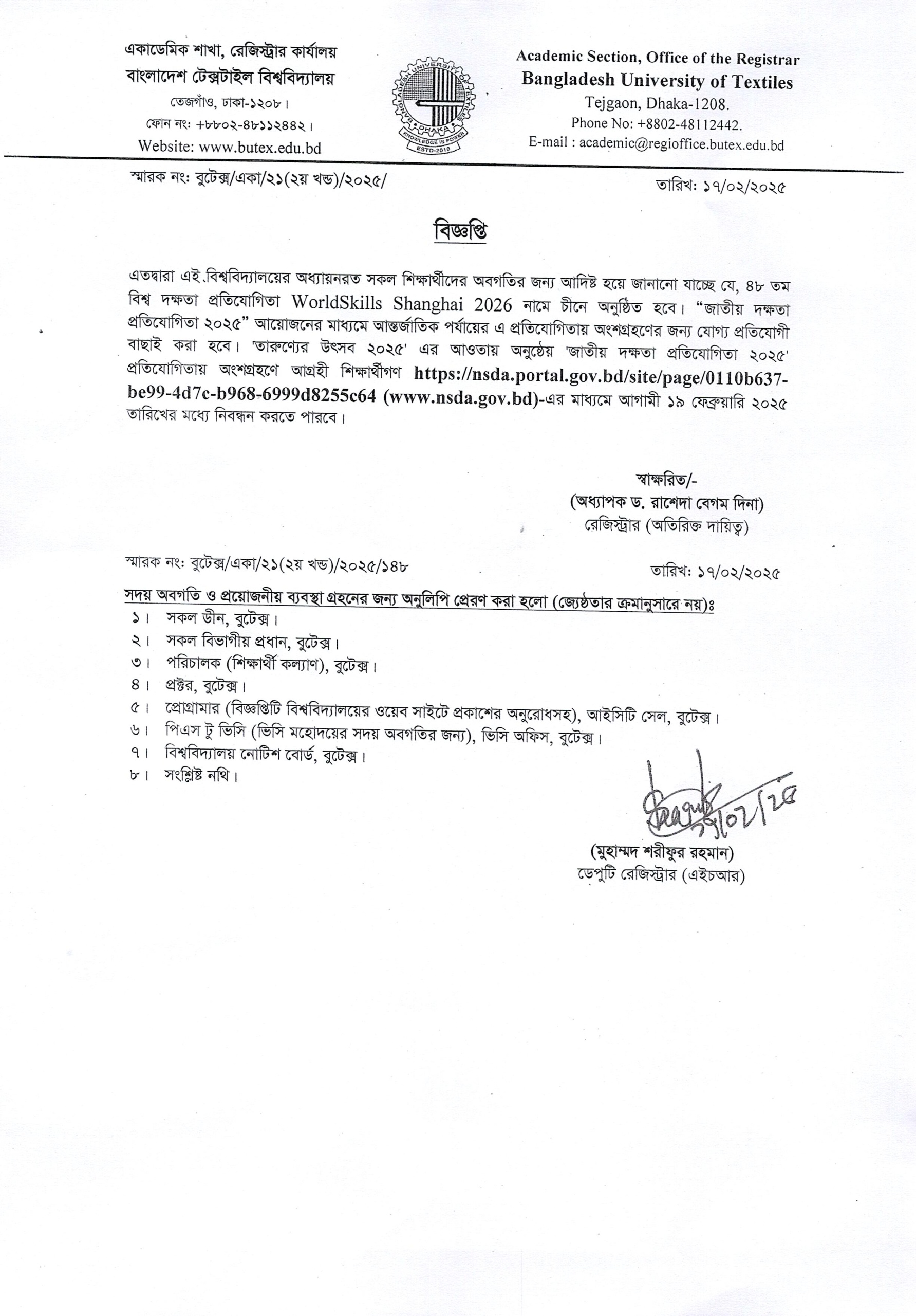 “জাতীয় দক্ষতা প্রতিযোগিতা ২০২৫” প্রতিযোগিতায় অংশগ্রহণ সংক্রান্ত বিজ্ঞপ্তি