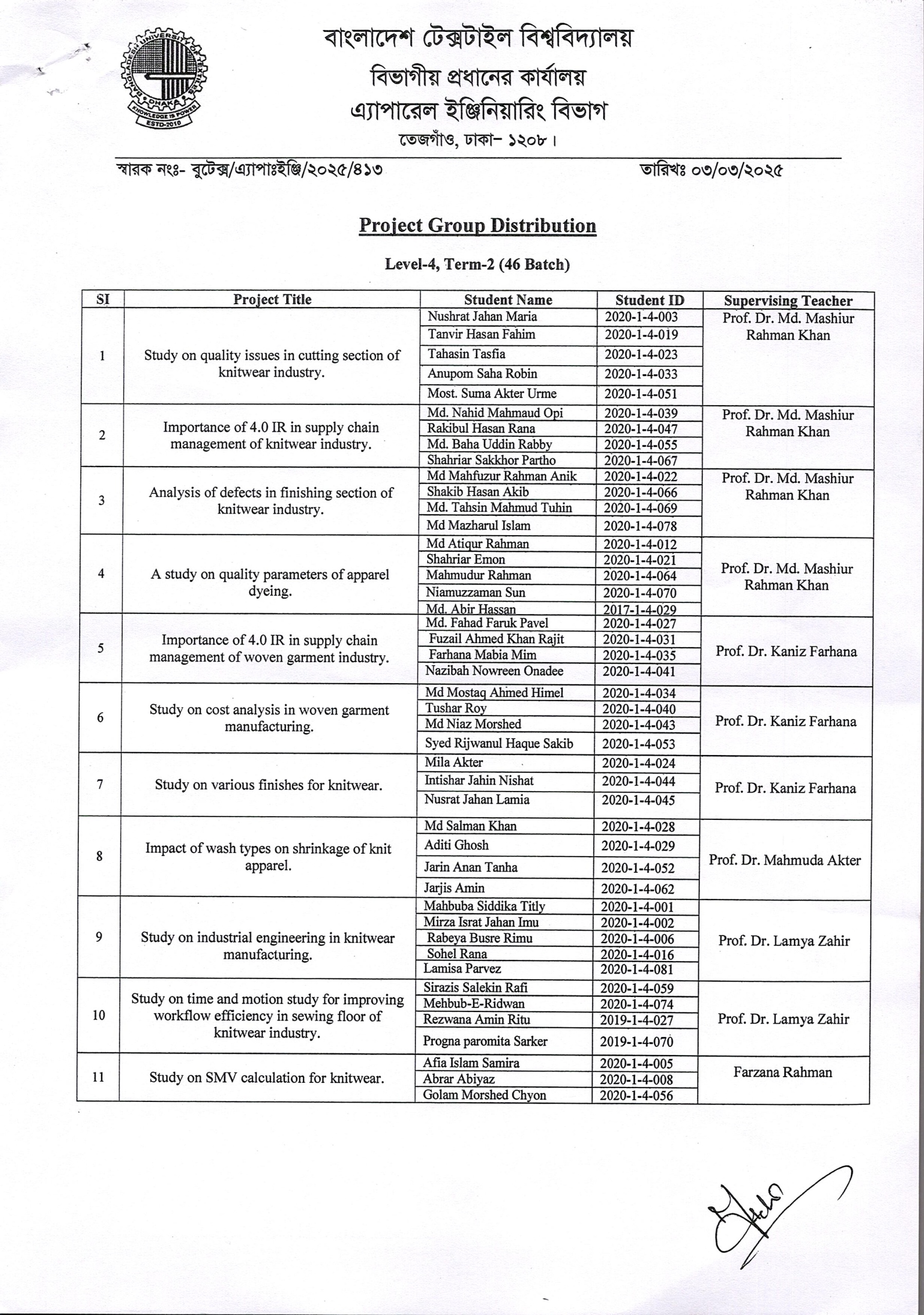 Project Group Distribution of B.Sc. in Textile Engineering (Apparel Dept.) L-4, T-2 (46th Batch)