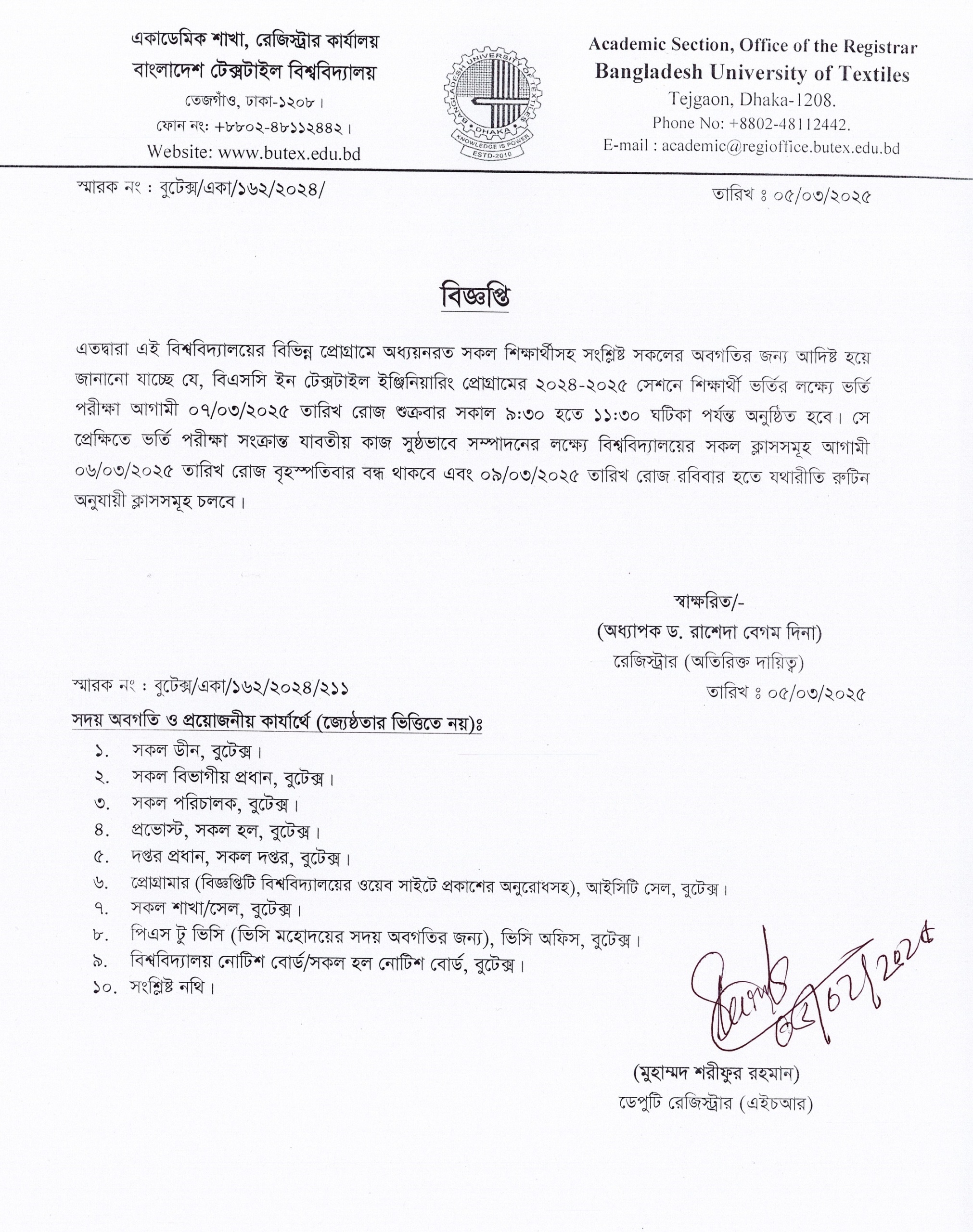 বি. এসসি. ইন টেক্সটাইল ইঞ্জিনিয়ারিং ২০২৪-২০২৫ সেশনে ভর্তি পরীক্ষার যাবতীয় কাজ সুষ্ঠভাবে সম্পাদনের লক্ষ্যে সকল ক্লাসসমূহ আগামী ০৬/০৩/২০২৫ তারিখ রোজ বৃহস্পতিবার বন্ধ থাকবে
