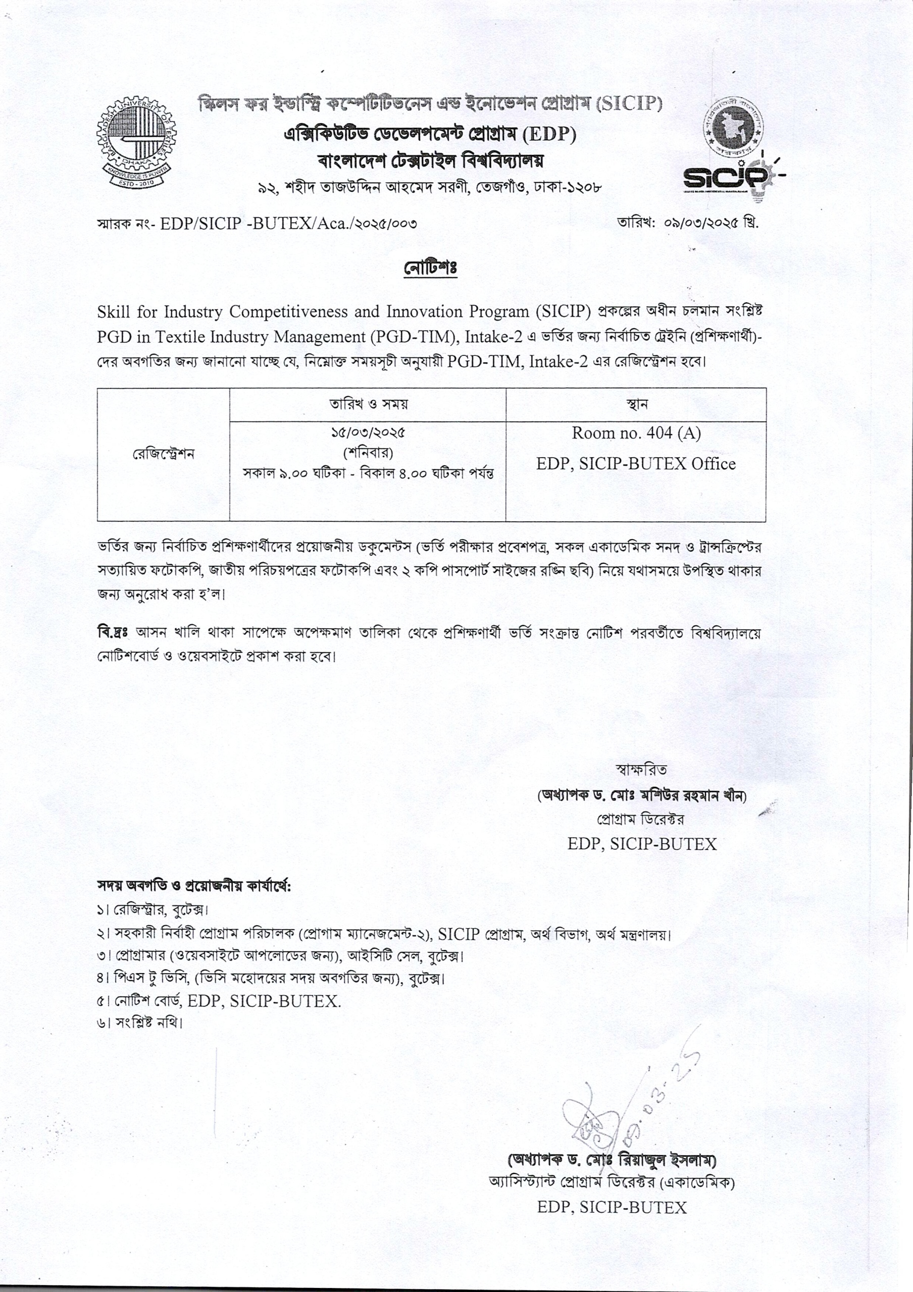 3rd Call Notice for Selected & Waiting Candidates of BSc in Textile Engineering Admission Test 2025-26