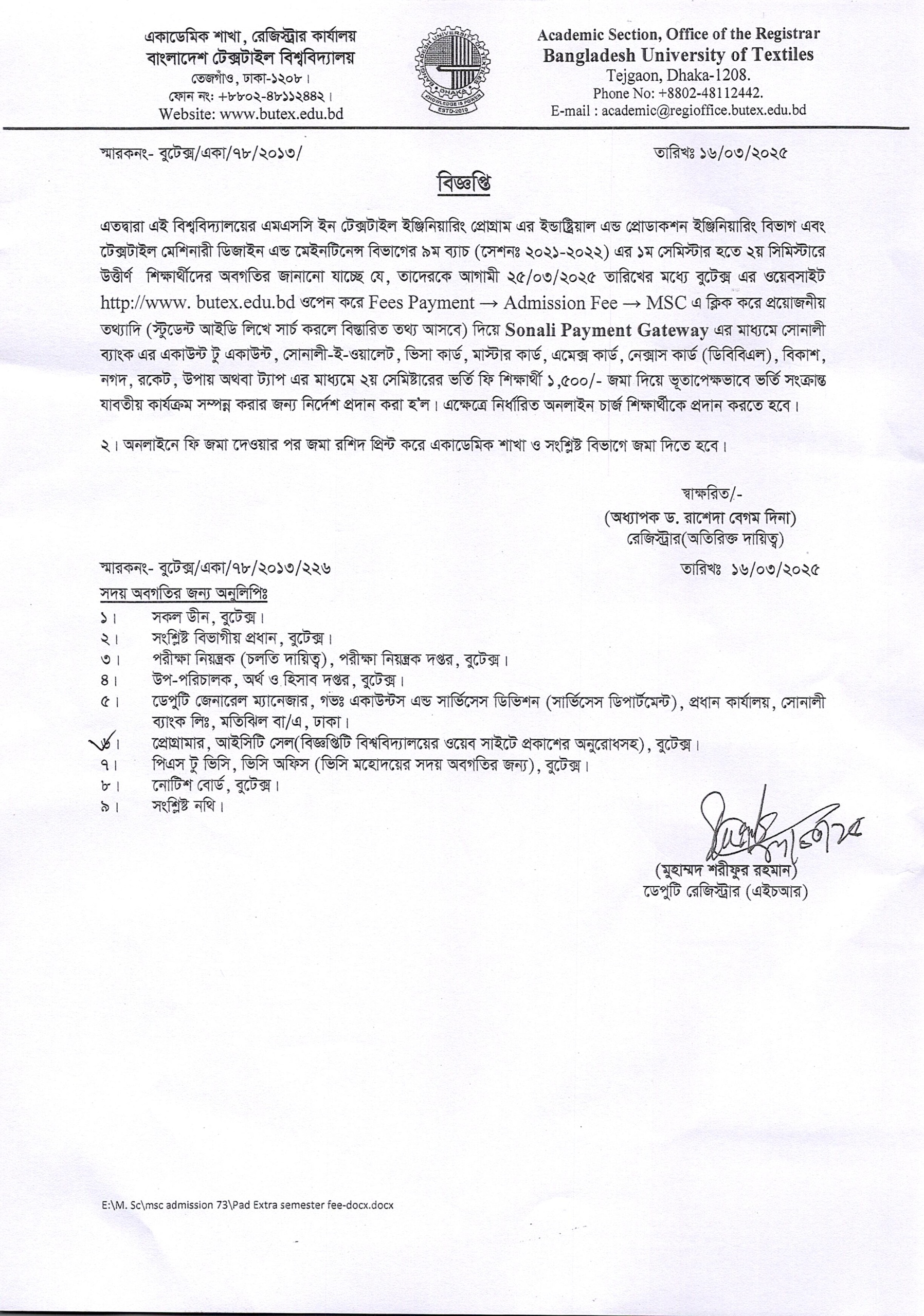 Fees Payment Notice of MSc in Textile Engineering 9th Batch (IPE, TMDM)