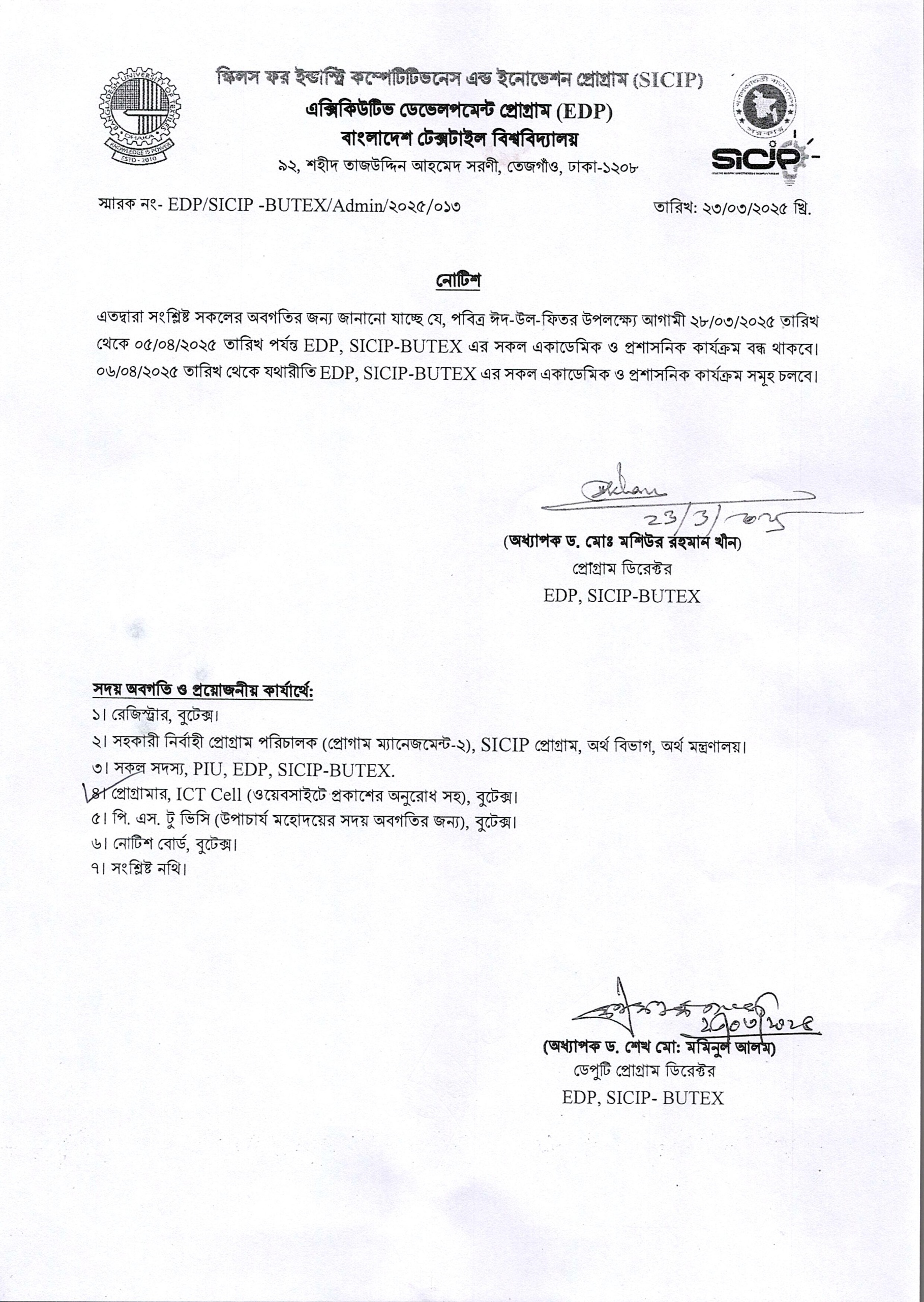 পবিত্র ঈদ-উল-ফিতর উপলক্ষ্যে আগামী ২৮/০৩/২০২৫ তারিখ থেকে ০৫/০৪/২০২৫ তারিখ পর্যন্ত EDP, SICIP-BUTEX এর সকল একাডেমিক ও প্রশাসনিক কার্যক্রম বন্ধ থাকবে