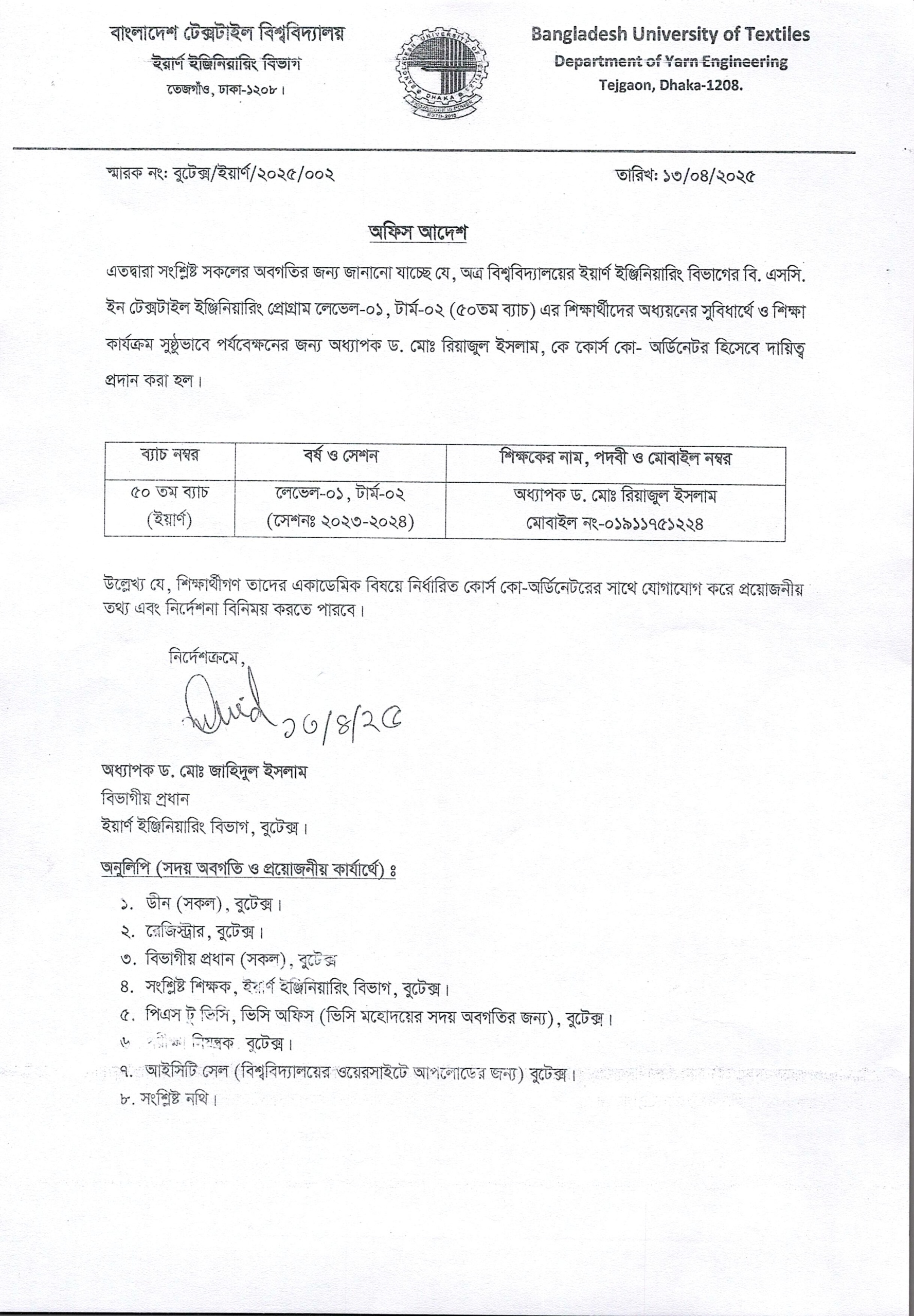 Course Co-ordinator Notice of Yarn Engineering Dept. (50 Batch)