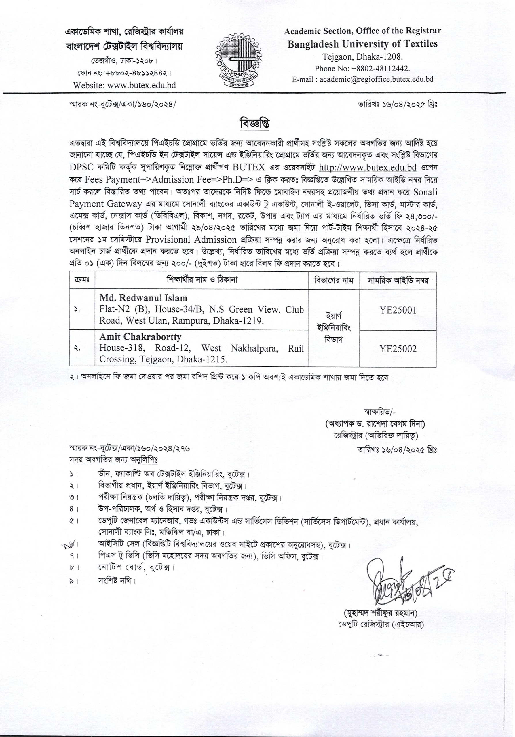 3rd Call Notice for Selected & Waiting Candidates of BSc in Textile Engineering Admission Test 2025-26