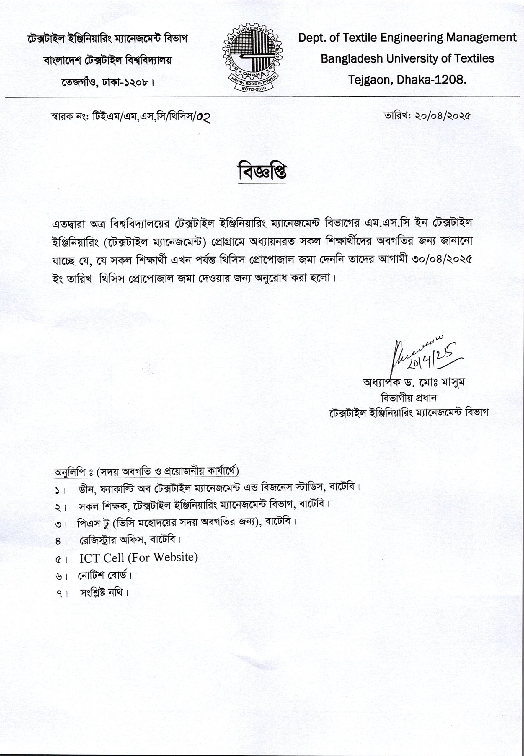 Name Correction Notice of BSc in Textile Engineering Program