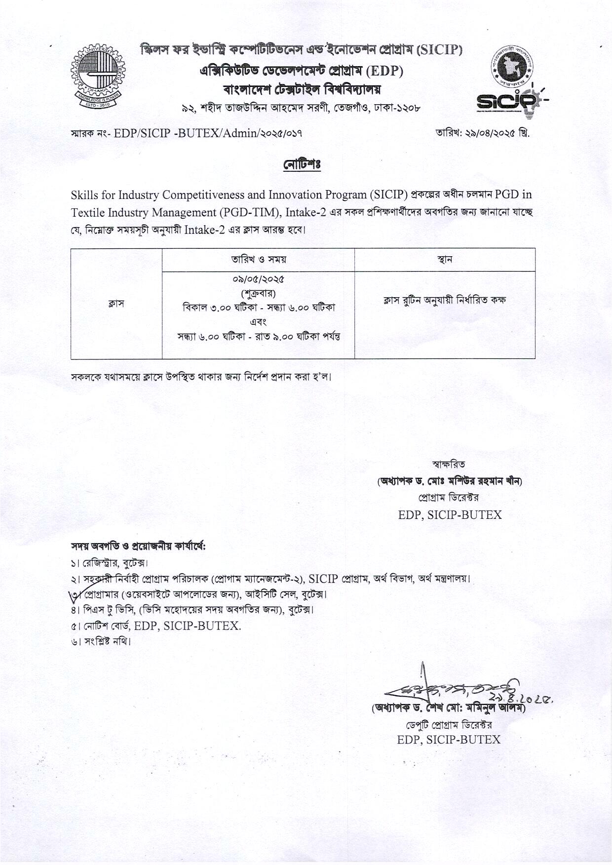 Readmission Notice of BSc in Textile Engineering Program