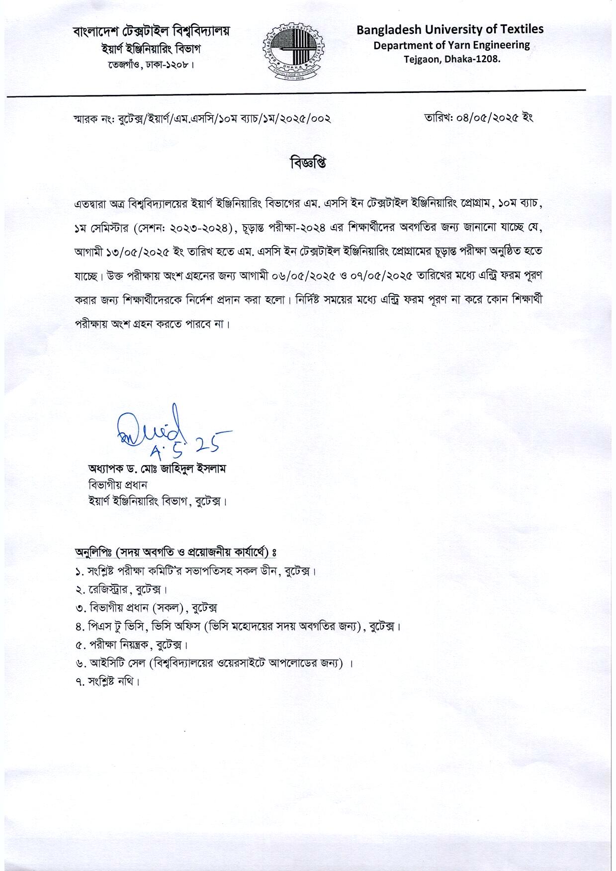 Entry Form Notice: MSc in Textile Engineering Program (Yarn) 10th Batch 1st Semester