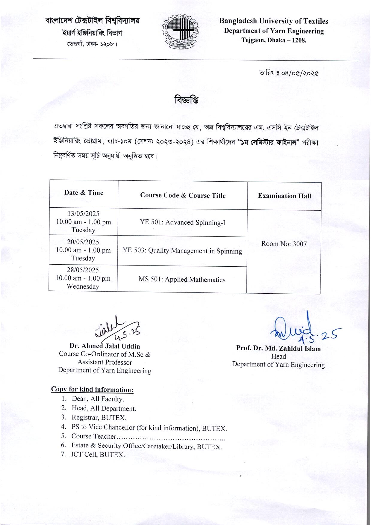 Exam Routine of MSc in Textile Engineering Program (Yarn) 10th Batch 1st Semester