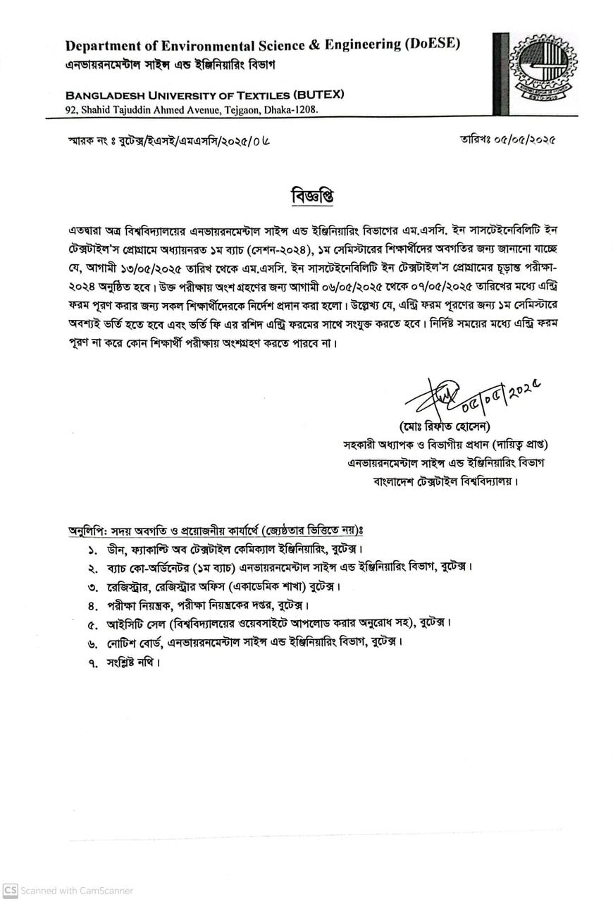 Entry Form Notice: MSc in Textile Engineering Program (ESE) 1st Batch 1st Semester