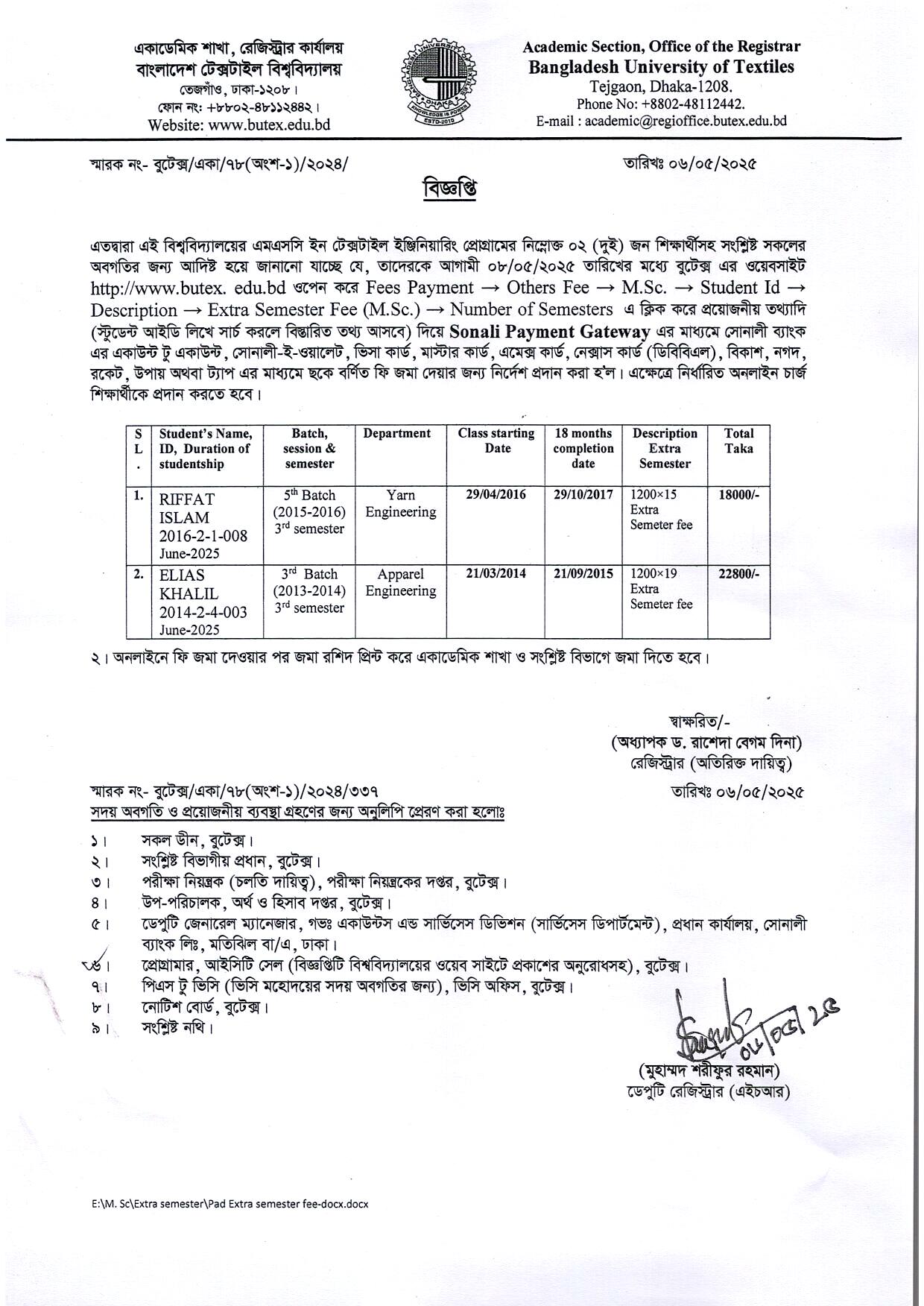 Fees Payment Notice of MSc in Textile Engineering (Yarn & Apparel)