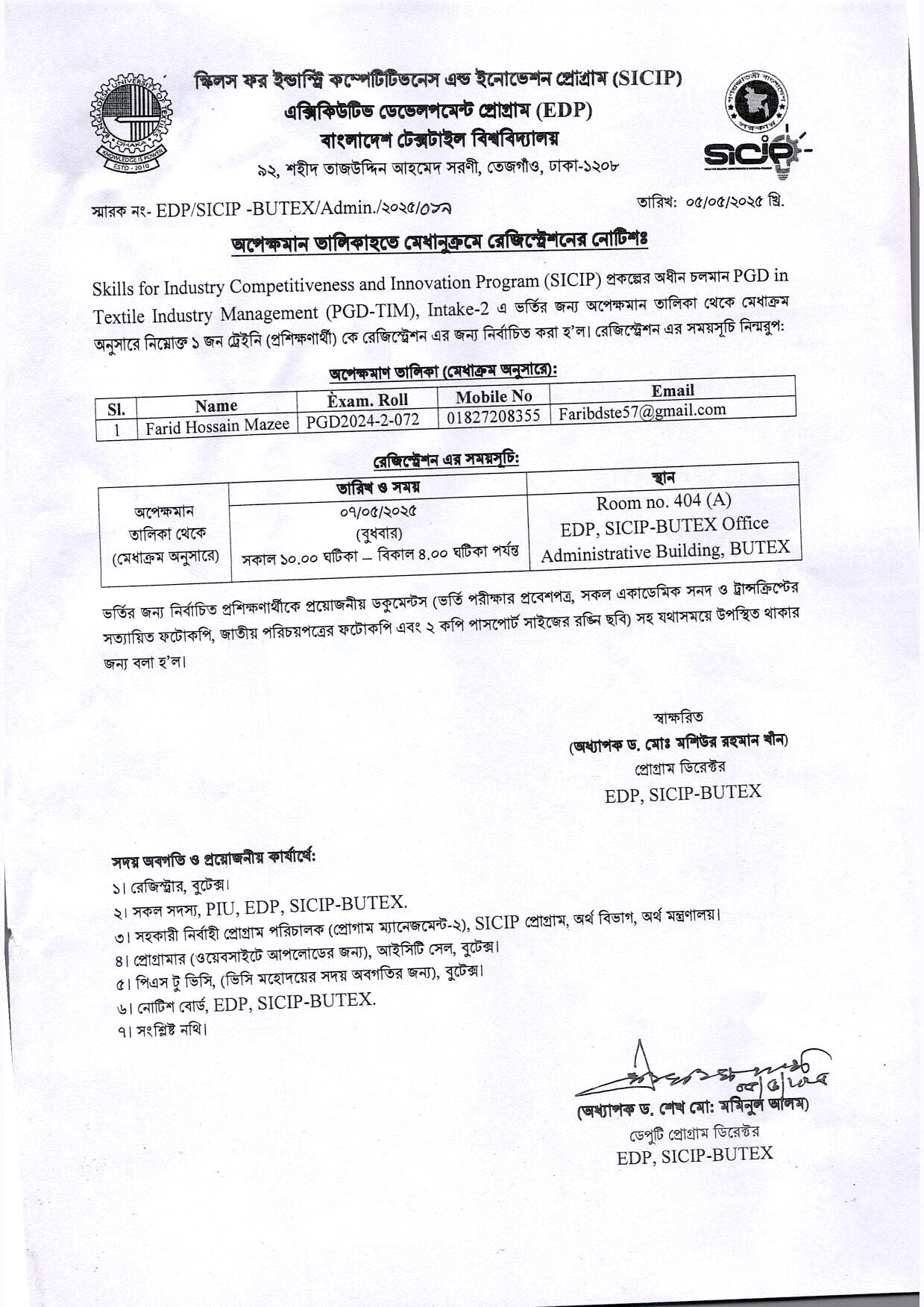 ইডিপি নোটিশঃ অপেক্ষমান তালিকা হতে মেধানুক্রমে রেজিস্ট্রেশন।