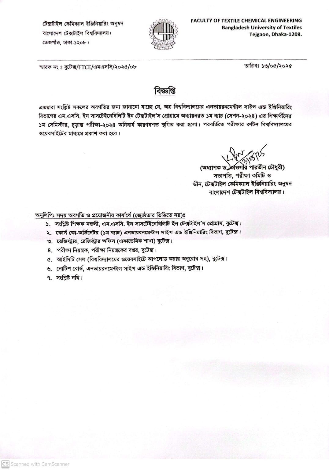 পরীক্ষা স্থাগিত বিজ্ঞপ্তিঃ ESE বিভাগের এম.এসসি. ইন টেক্সটাইল ইঞ্জিঃ প্রোগ্রাম, ১ম ব্যাচ এর ১ম সেমিস্টার ফাইনাল পরীক্ষা-২০২৪।