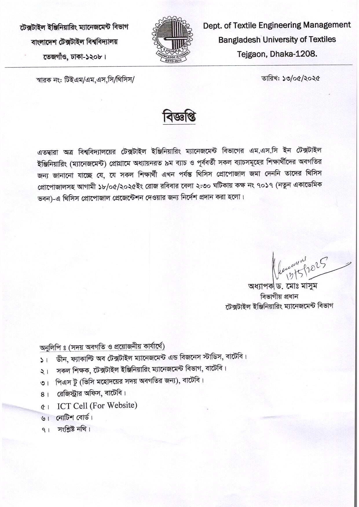 বিজ্ঞপ্তিঃ টেক্সটাইল ইঞ্জিঃ ম্যানেজমেন্ট বিভাগের এম.এসসি ইন টেক্সটাইল ইঞ্জিঃ প্রোগ্রামের ৯ম ব্যাচের থিসিস ওয়ার্ক বিষয়।