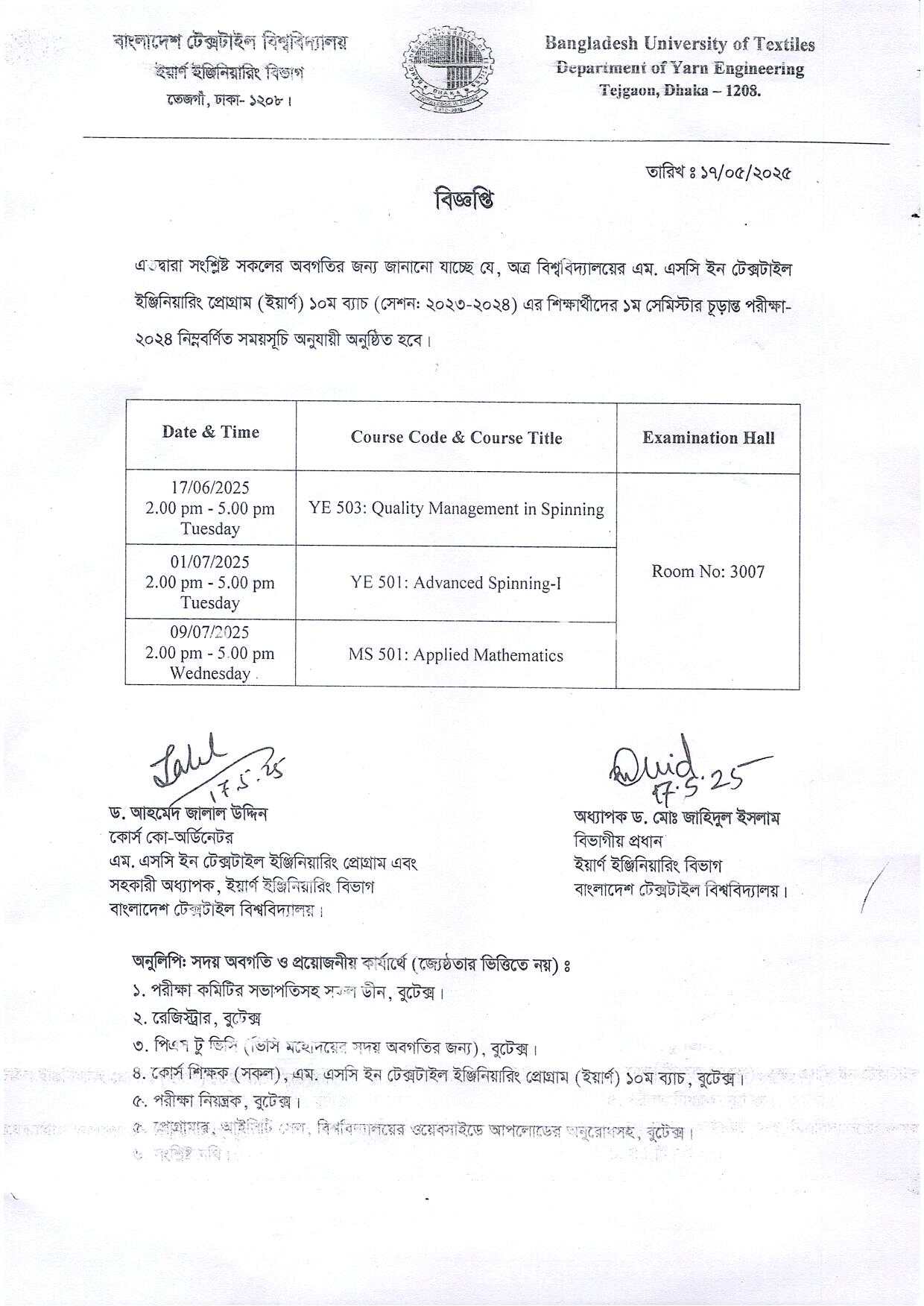 Exam Routine of MSc in Textile Engineering Program (Yarn) 10th Batch 1st Semester