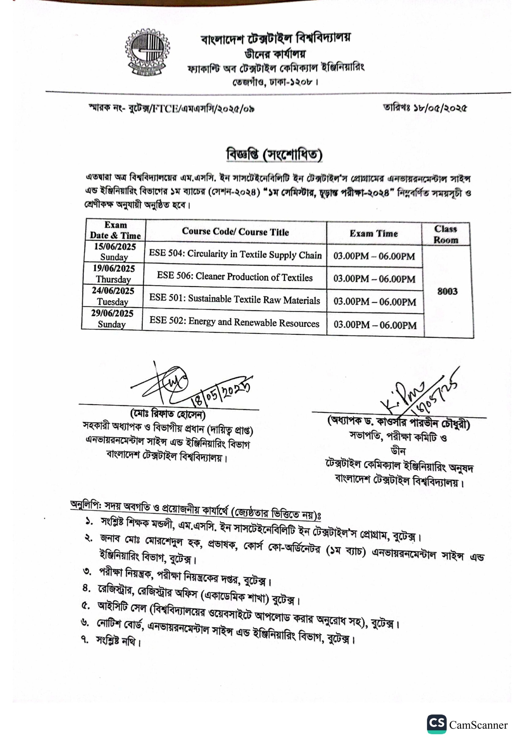 Exam Routine of MSc in Textile Engineering Program (ESE) 1st Batch 1st Semester, Exam-2024.