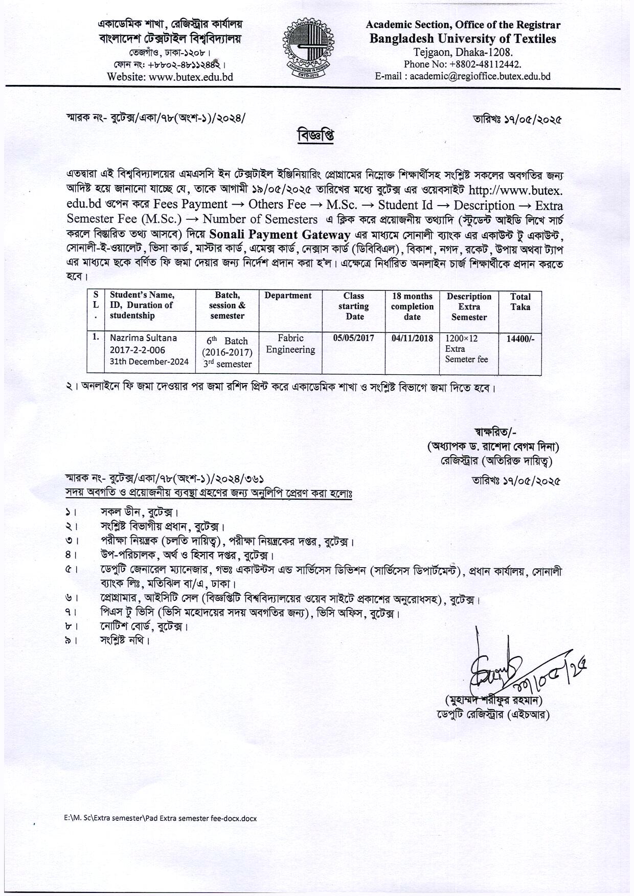 Fees Payment Notice of MSc in Textile Engineering (FE)