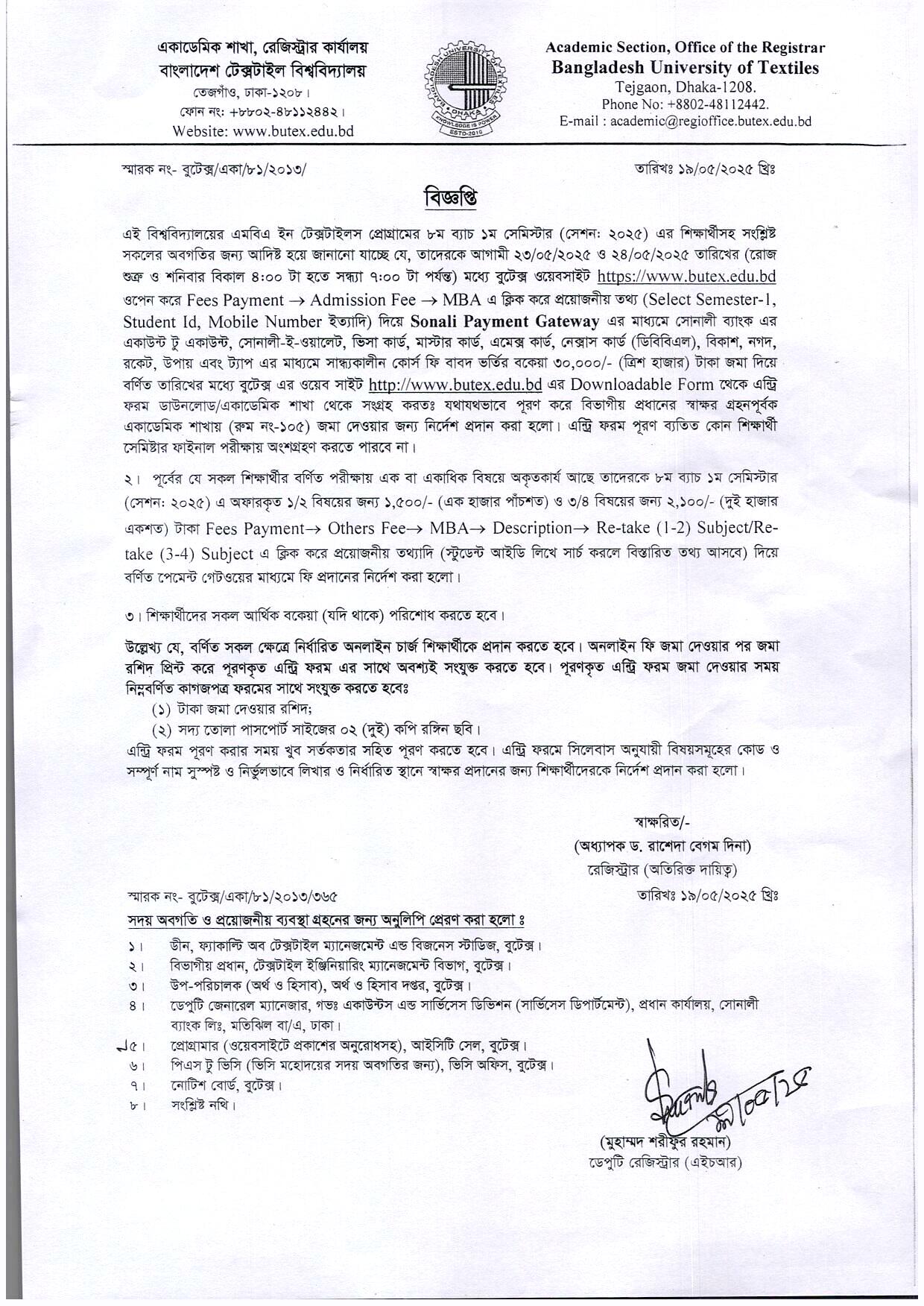 Fees Payment Notice: এমবিএ ইন টেক্সটাইলস প্রোগ্রামের ৮ম ব্যাচ ১ম সেমিষ্টার।