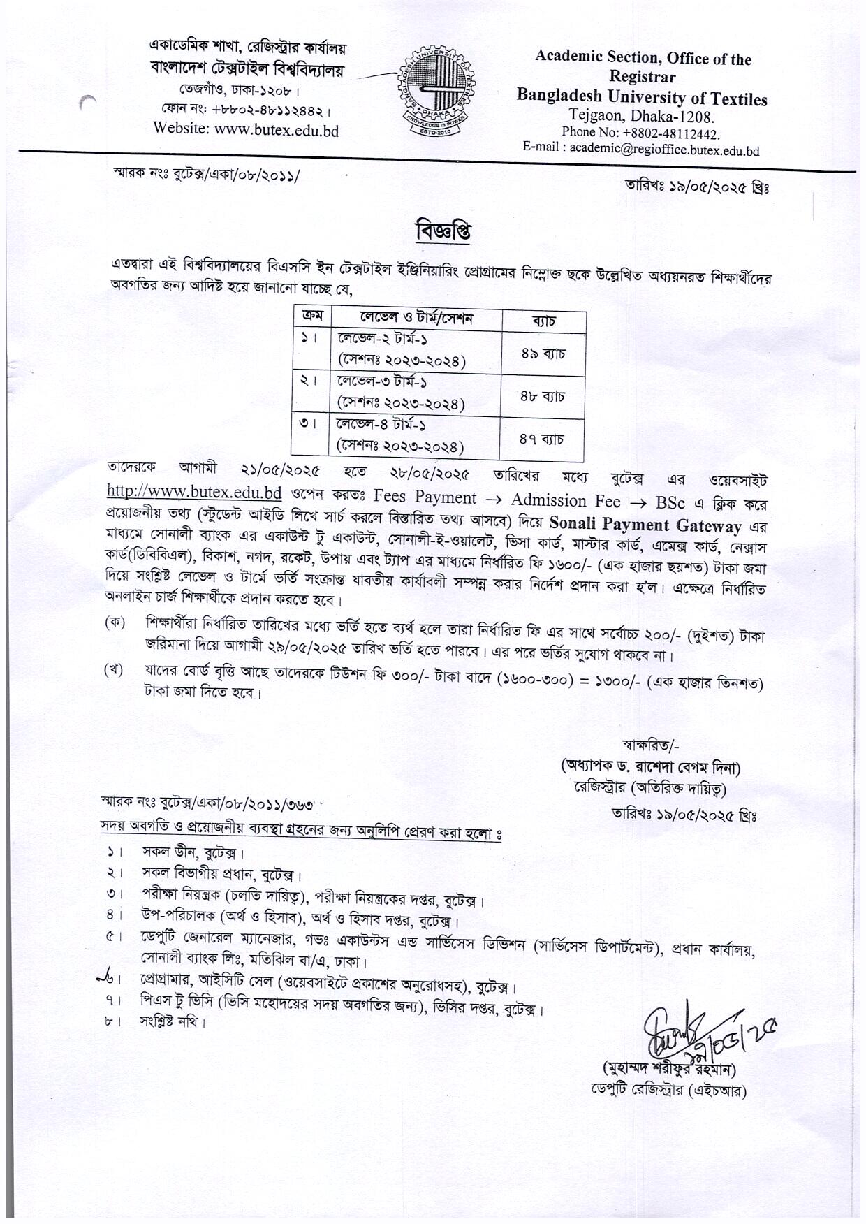 Fees Payment Notice of B.Sc. in Textile Engineering (47, 48 & 49 Batch)