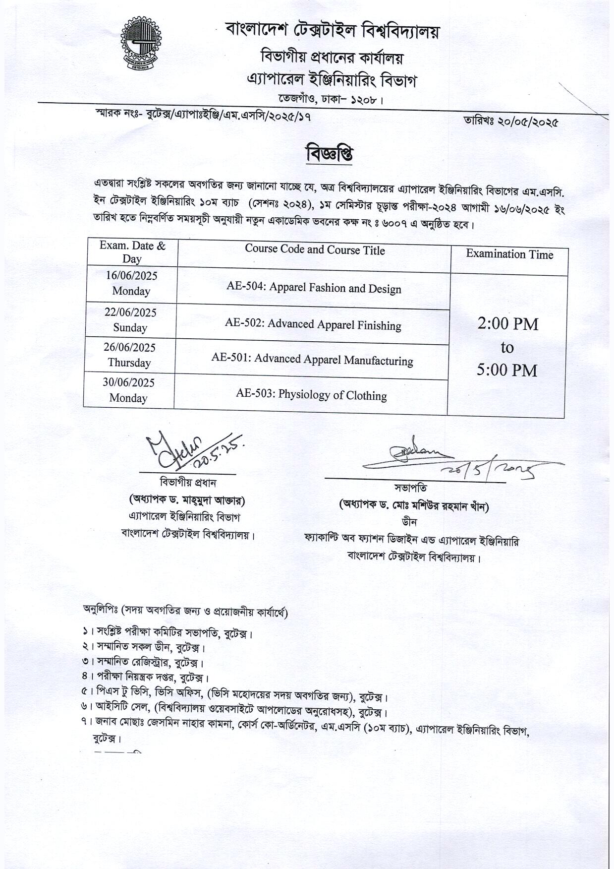 Exam Routine of MSc in Textile Engineering Program (Apparel) 10th Batch 1st Semester, Exam-2024.