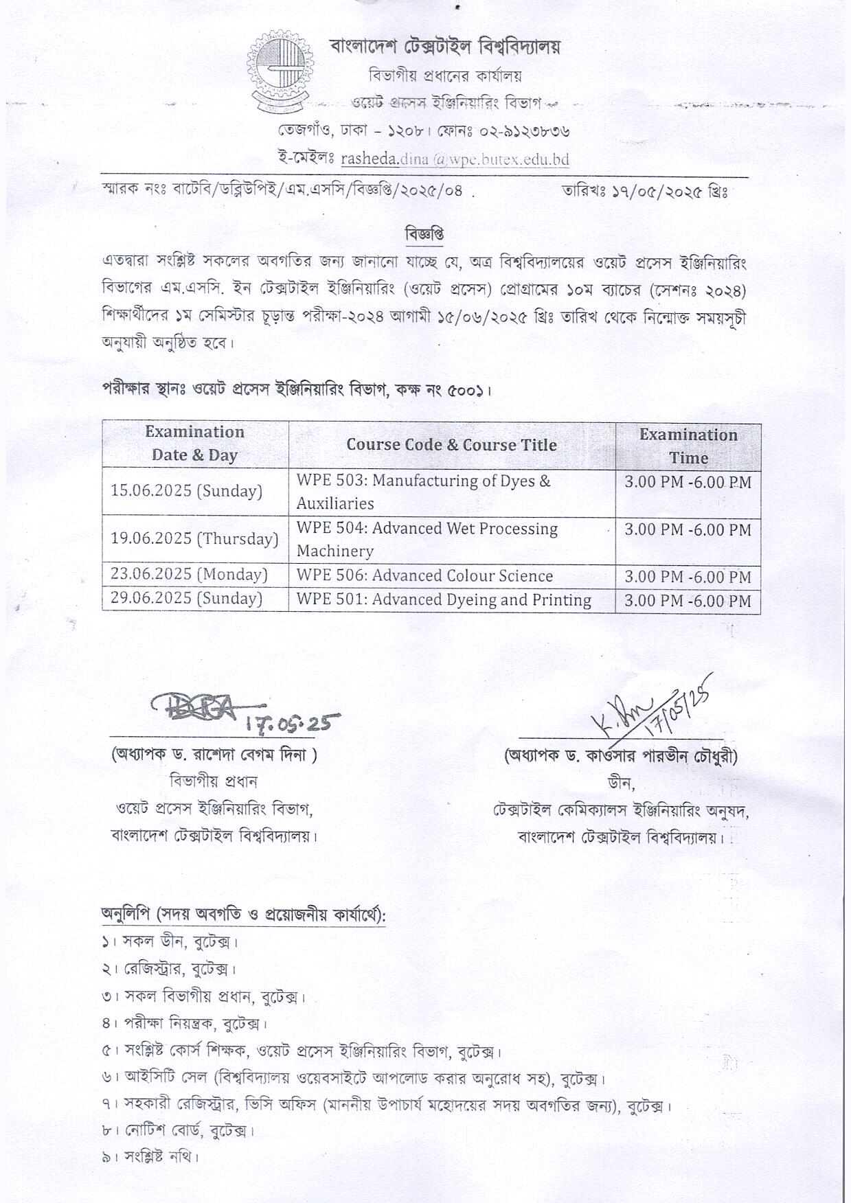 Exam Routine of MSc in Textile Engineering Program (WPE) 10th Batch 1st Semester, Exam-2024.