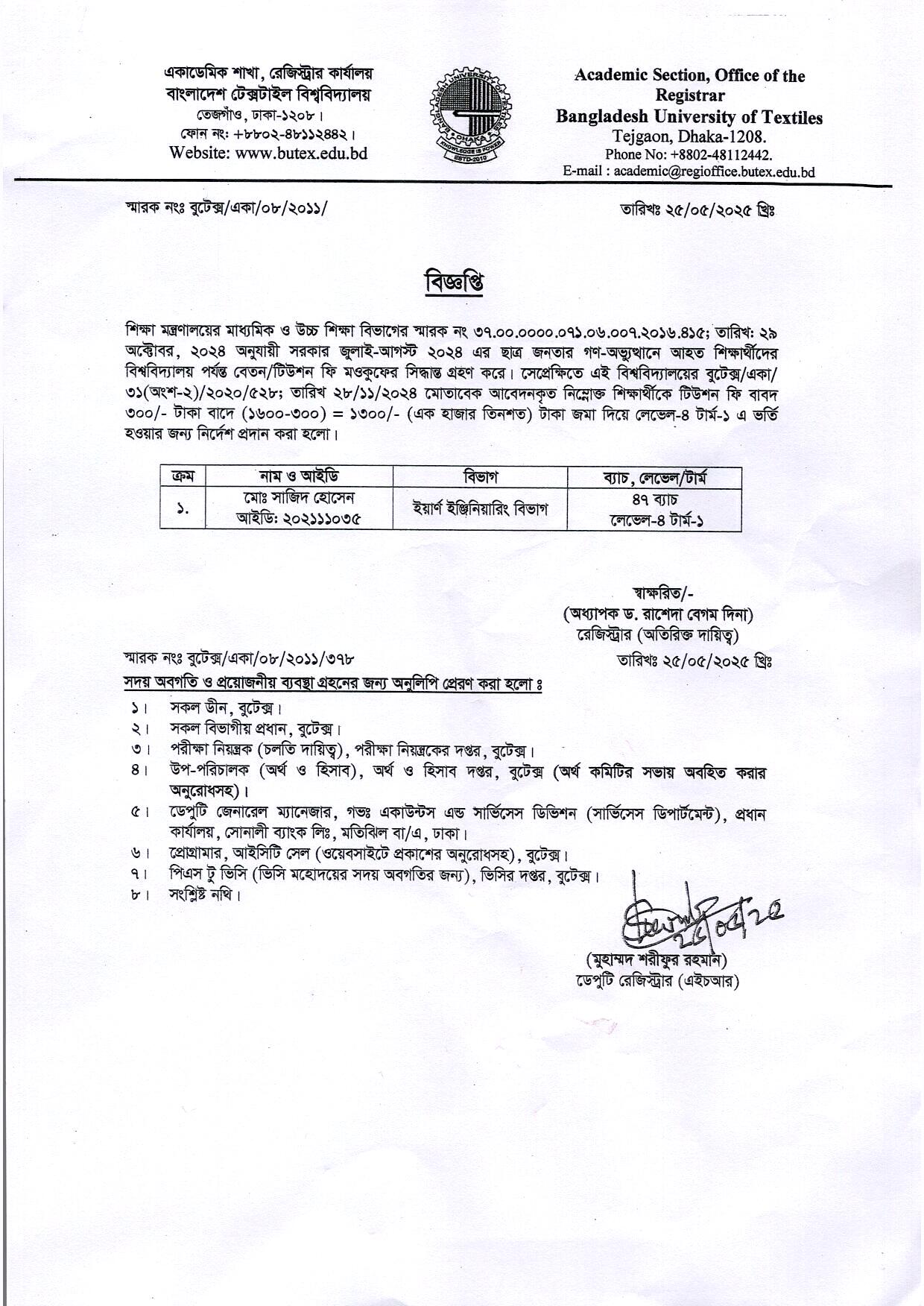 Admission Cancellation Notice: BSc in Textile Engineering 51th Batch