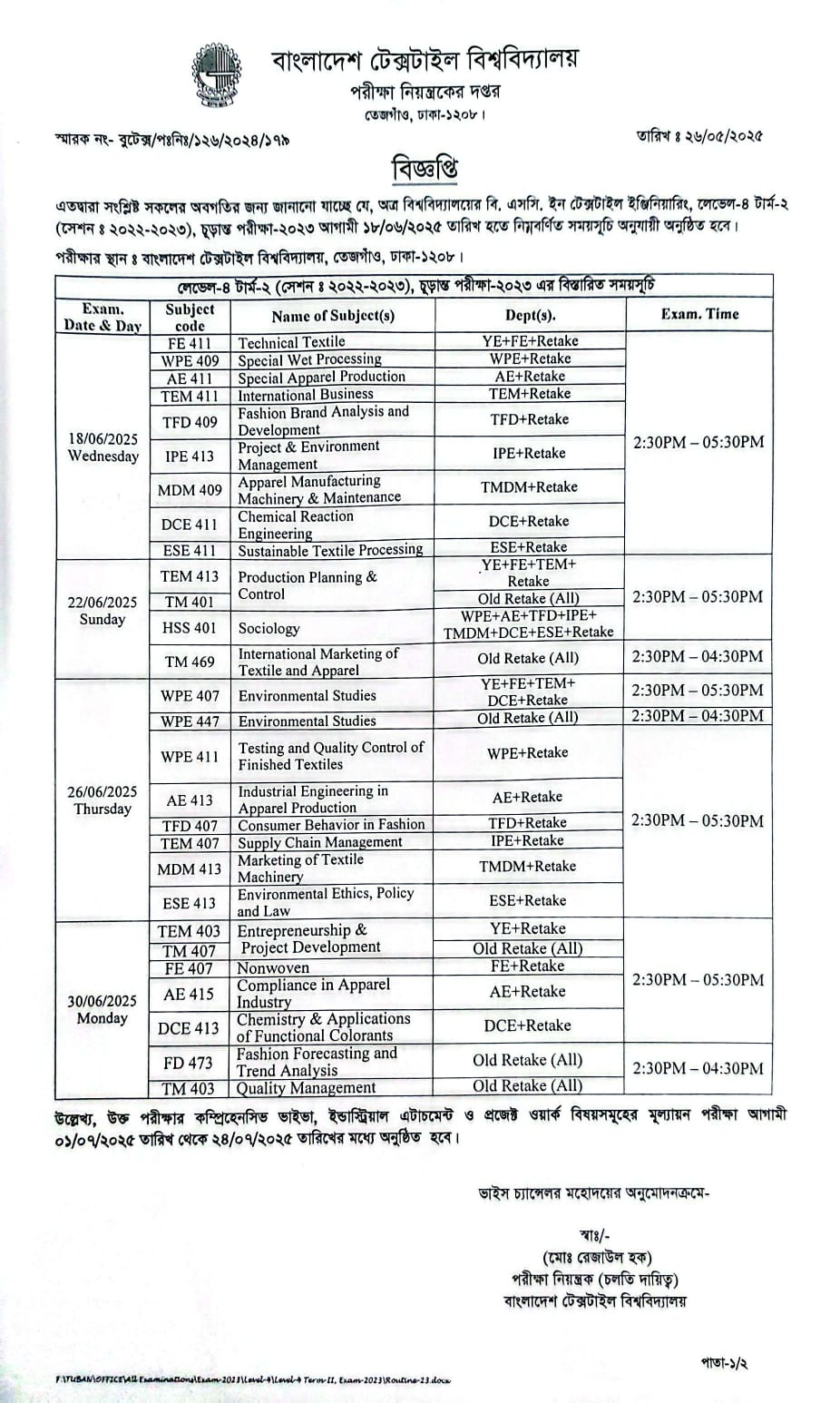 Exam Schedule: BSc in Textile Engineering L-4 T-2 Exam-2023