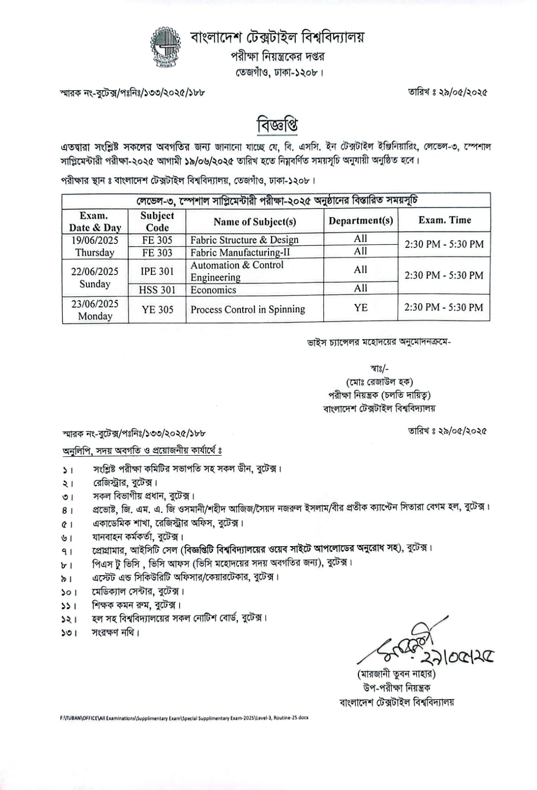 পরীক্ষার সময়সূচি: বি. এসসি. ইন টেক্সটাইল ইঞ্জিনিয়ারিং লেভেল-৩ স্পেশাল সাপ্লিমেন্টারি পরীক্ষা-২০২৫