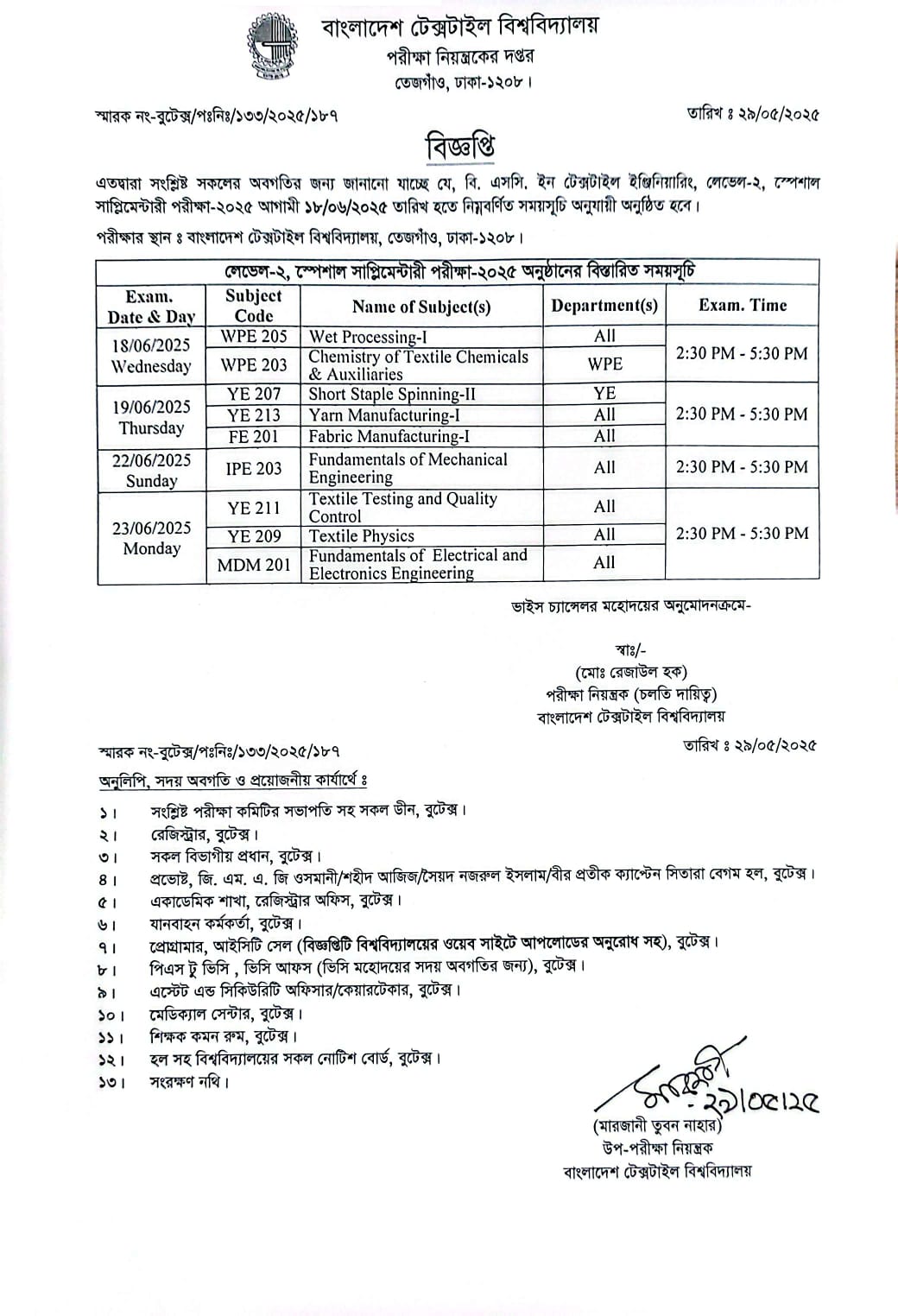 পরীক্ষার সময়সূচি: বি. এসসি. ইন টেক্সটাইল ইঞ্জিনিয়ারিং লেভেল-২ স্পেশাল সাপ্লিমেন্টারি পরীক্ষা-২০২৫
