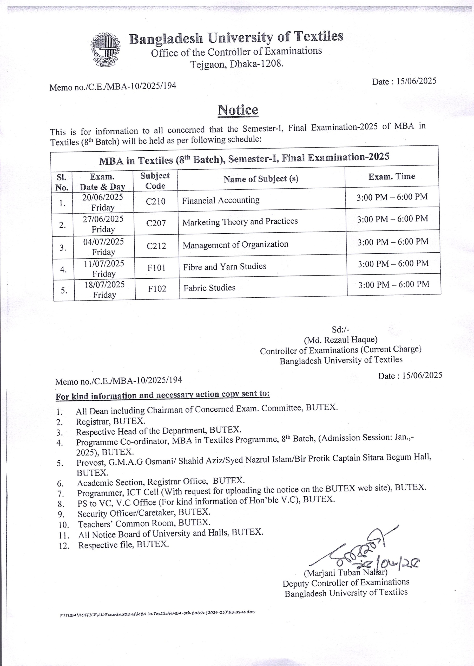Exam Schedule: MBA in Textiles Program 8th Batch Semester-1 Examination: 2025