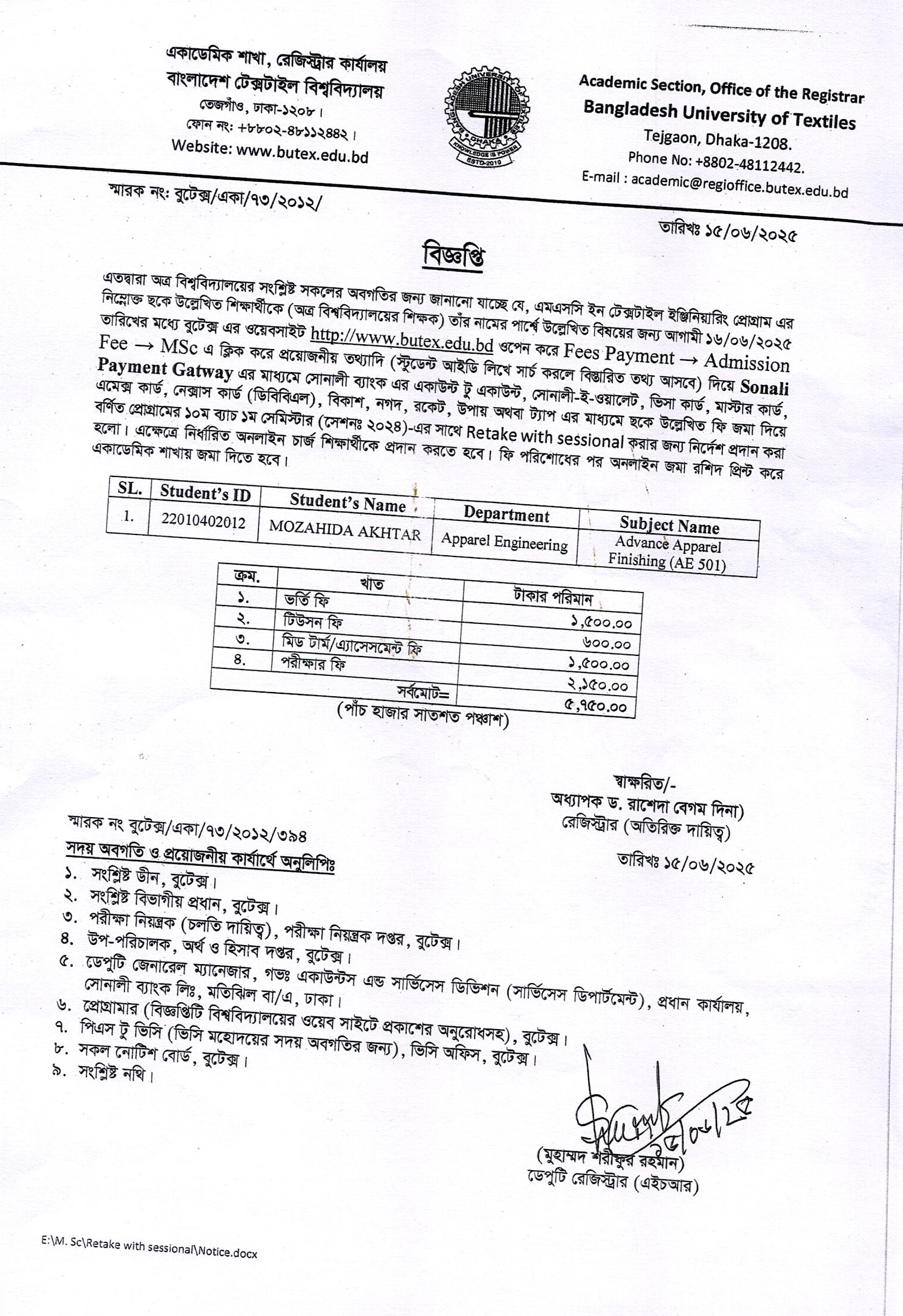 Fees Payment Notice of MSc in Textile (Apparel) Engineering