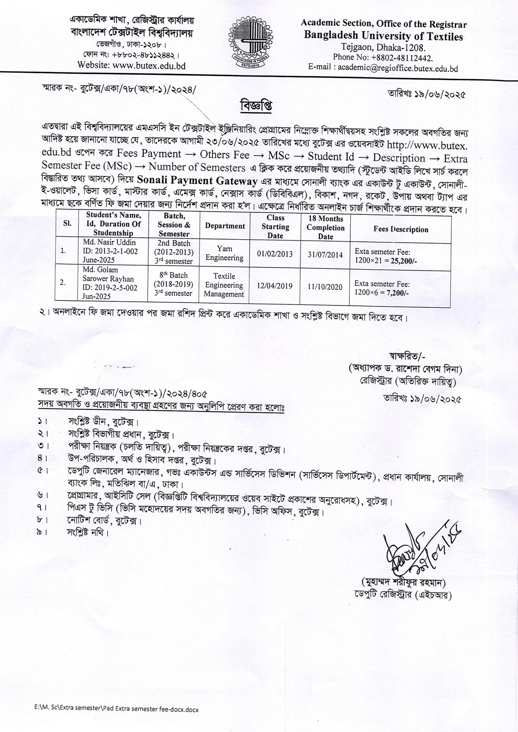 Fees Payment Notice of MSc in Textile Engineering
