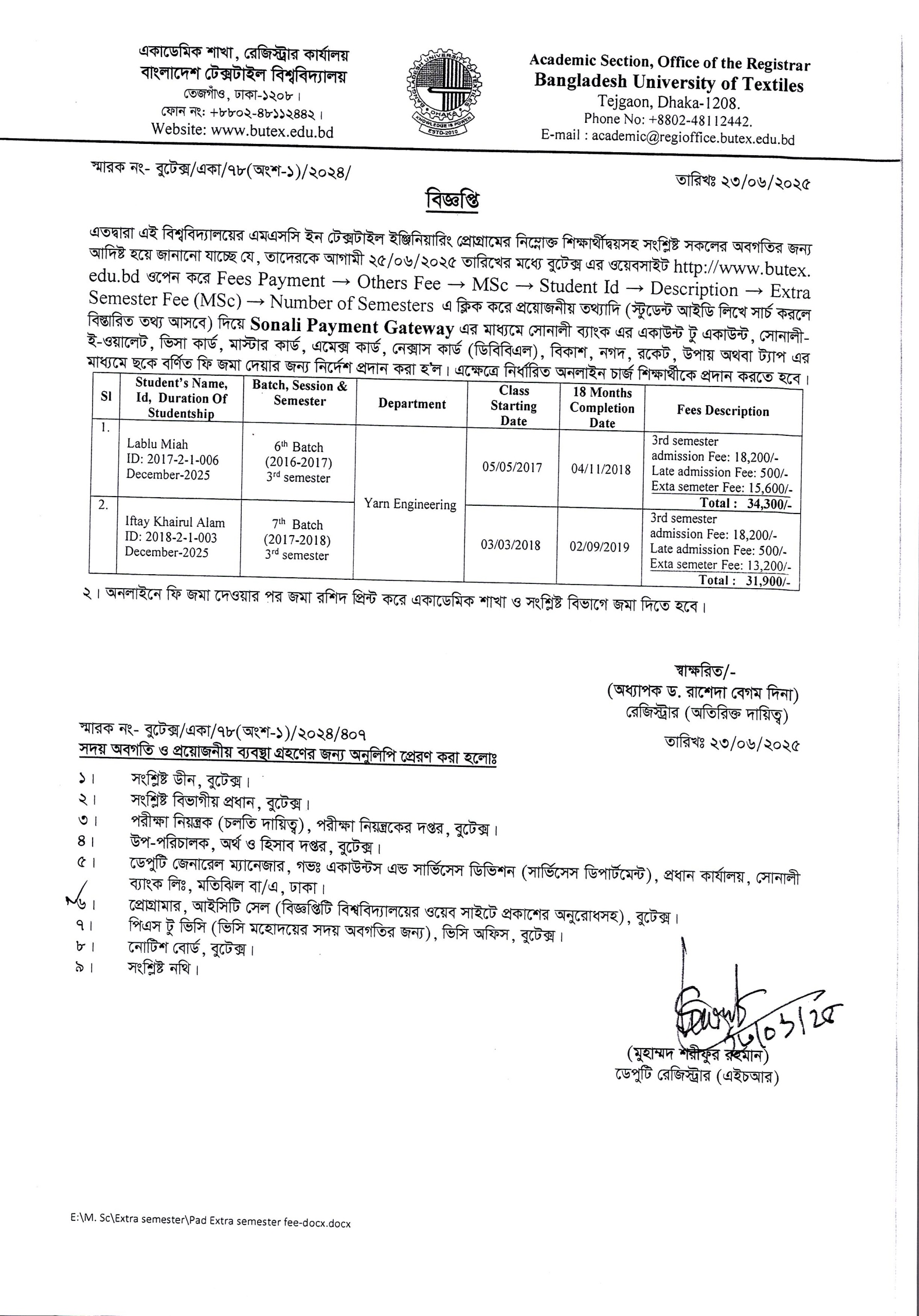 Fees Payment Notice of MSc in Textile Engineering