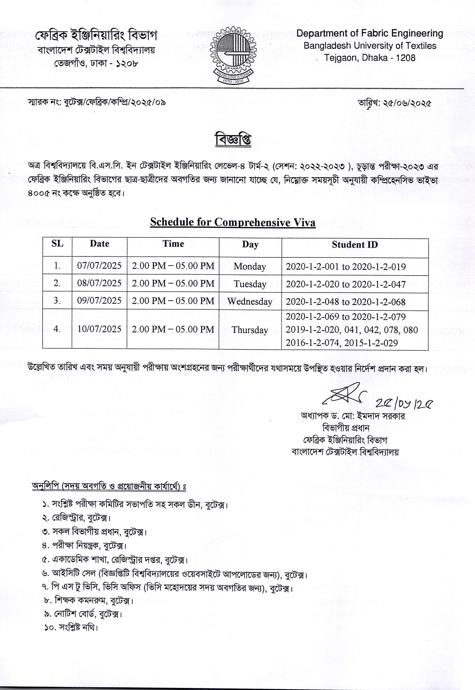 Comprehensive Viva of BSc in Textile Engineering (Fabric Dept.) L-4 T-2 Exam-2023