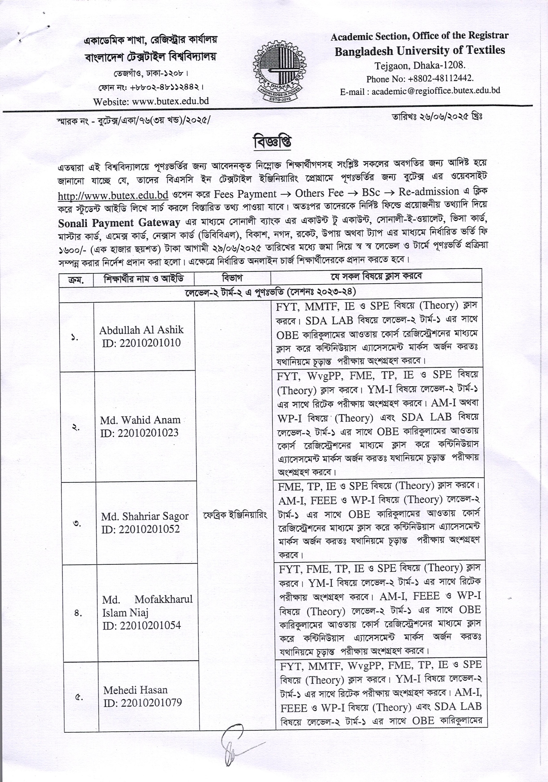 Re-Admission Notice: BSc in Textile Engineering L2-T2