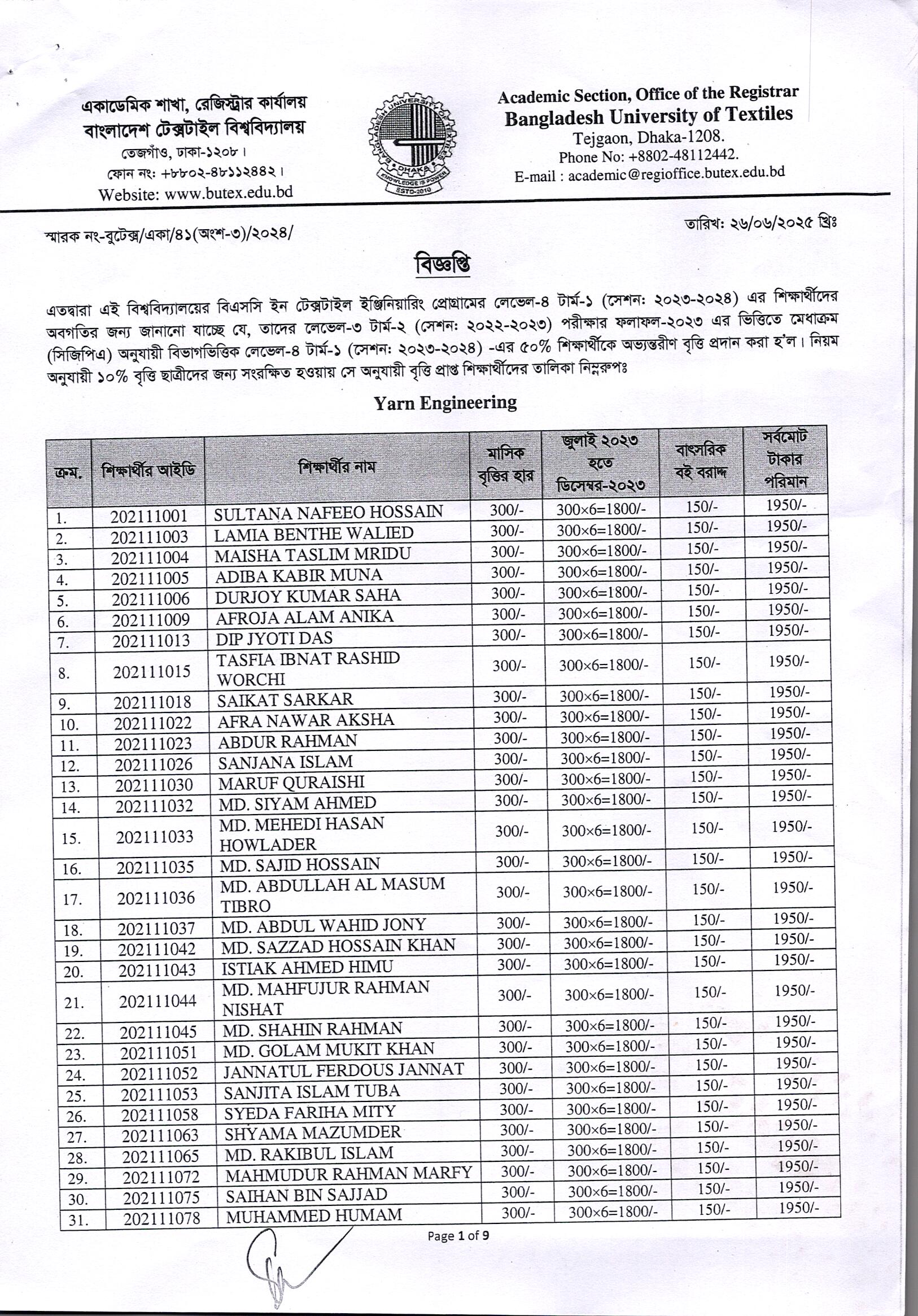 Academic Scholarship Notice of B.Sc. in Textile Engineering L4-T1