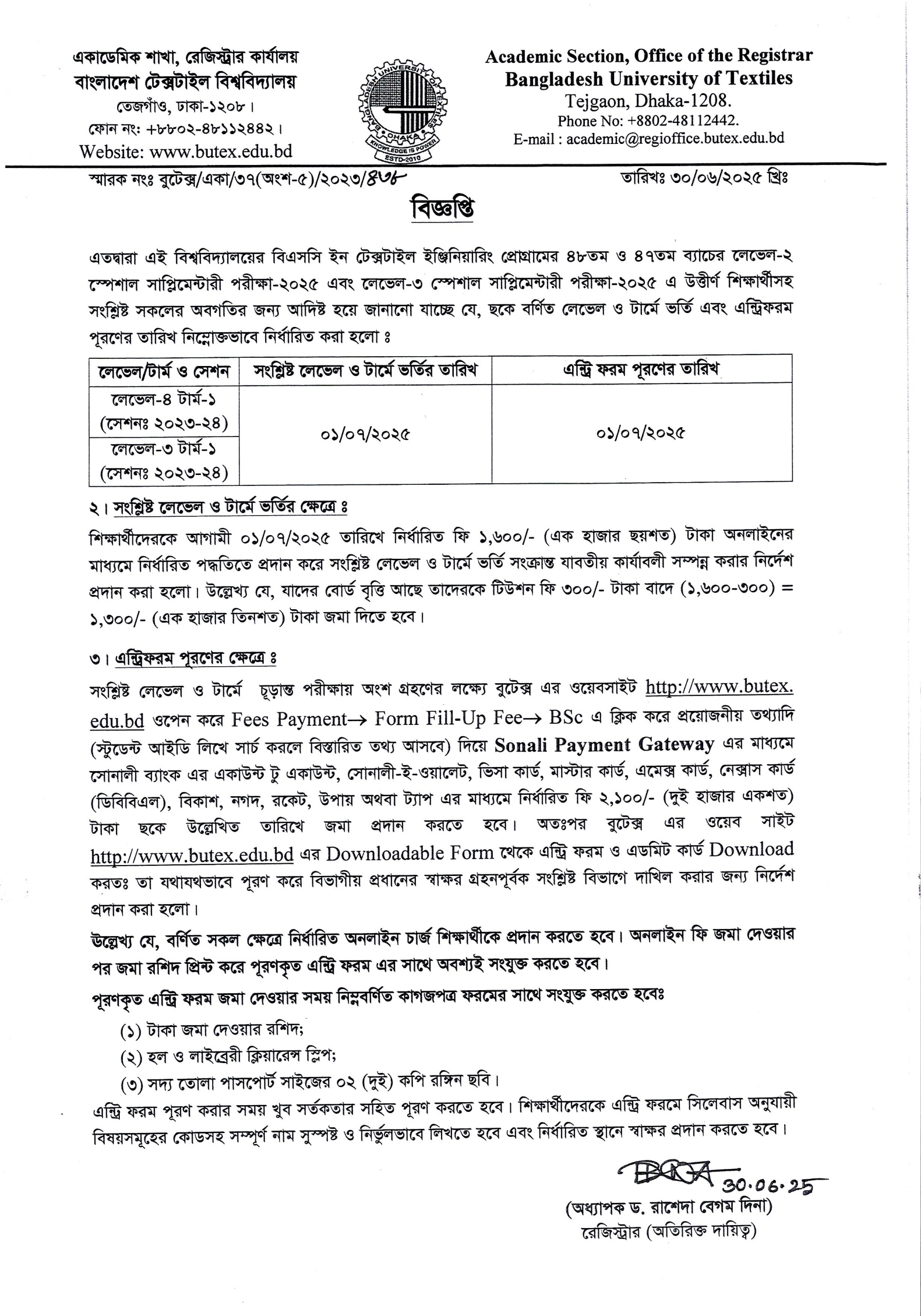 Entry Form for L-2 Special Supplementary Exam: BSc in Textile Engineering