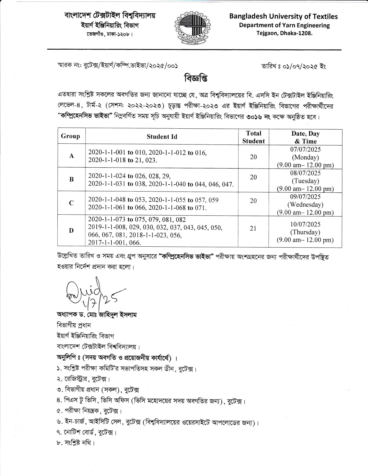 Comprehensive Viva of BSc in Textile Engineering (Yarn Dept.) L-4 T-2