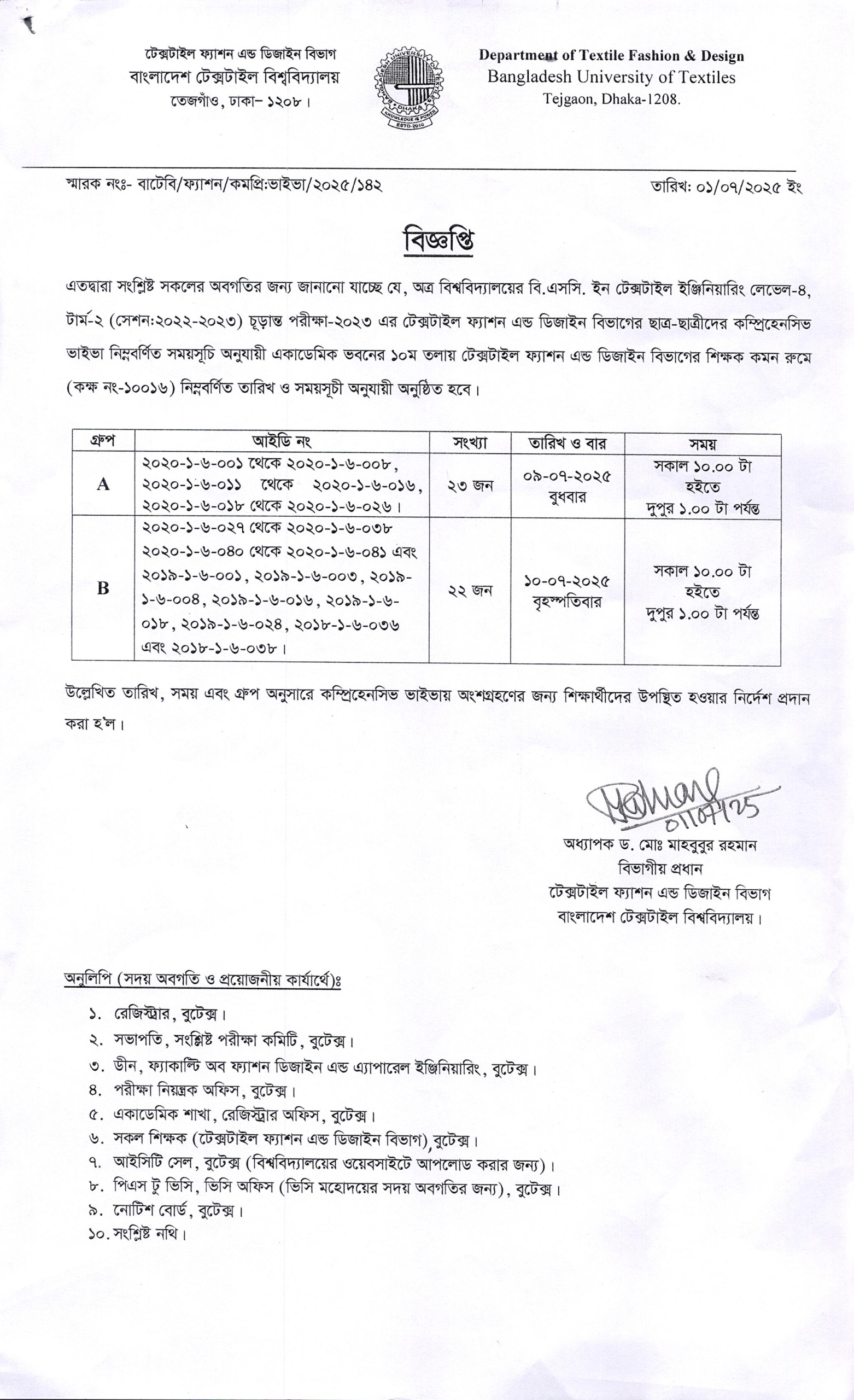 Comprehensive Viva of BSc in Textile Engineering (TFD Dept.) L-4 T-2