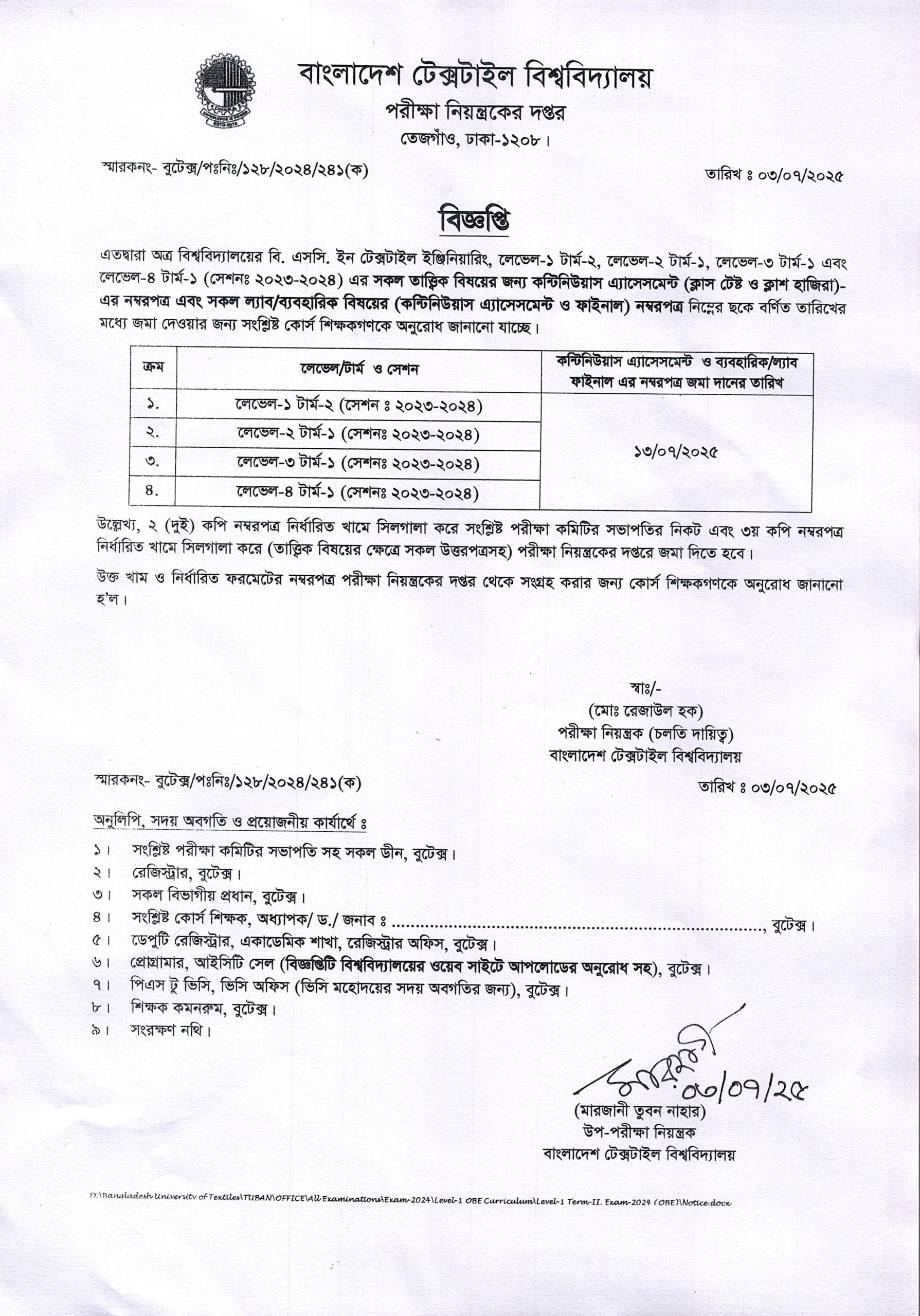 Continuous Assessment Notice of BSc in Textile Engineering L1-T2, L2 -T1, L3-T1, L4-T1