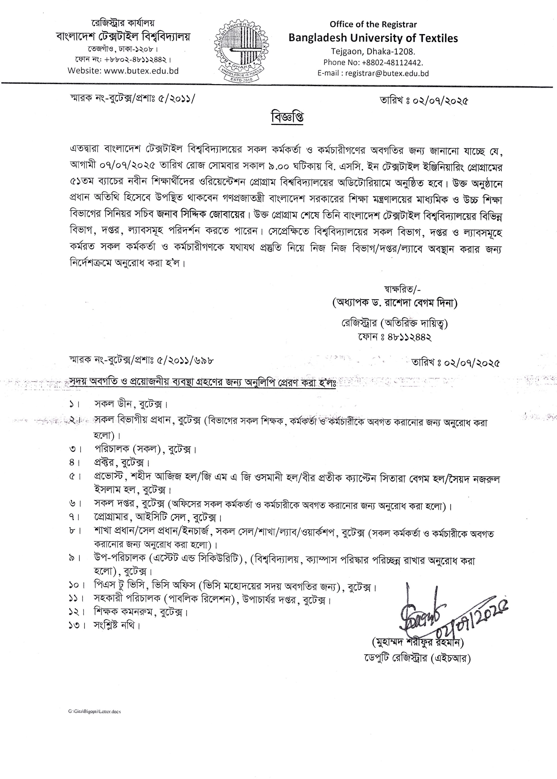 Orientation Program of 51st Batch of BSc in Textile Engineering Will be Held on 7 July, 2025