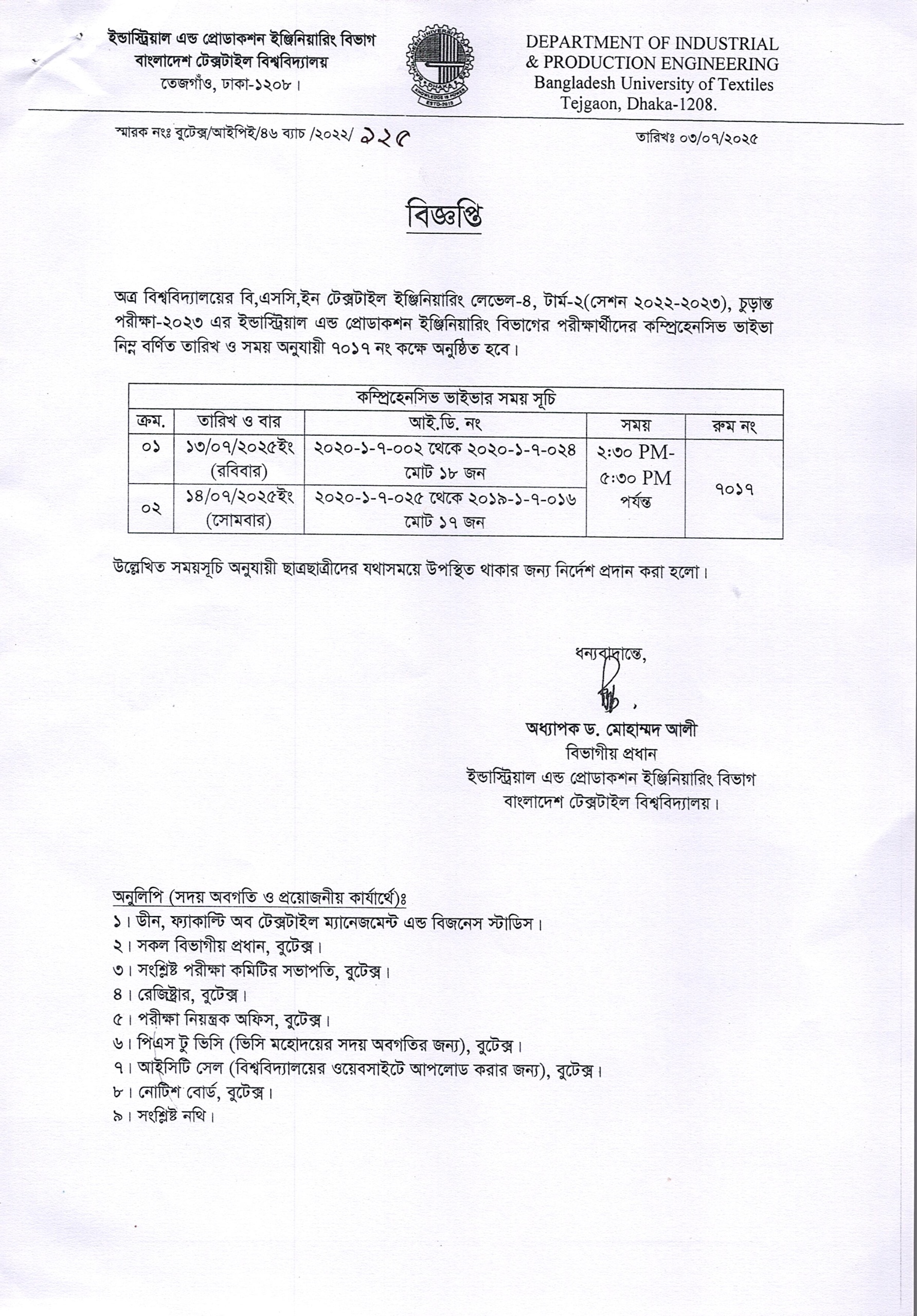 IPE Dept. Comprehensive Viva, Project Work & Industrial Attachment of BSc in Textile Engineering L-4 T-2