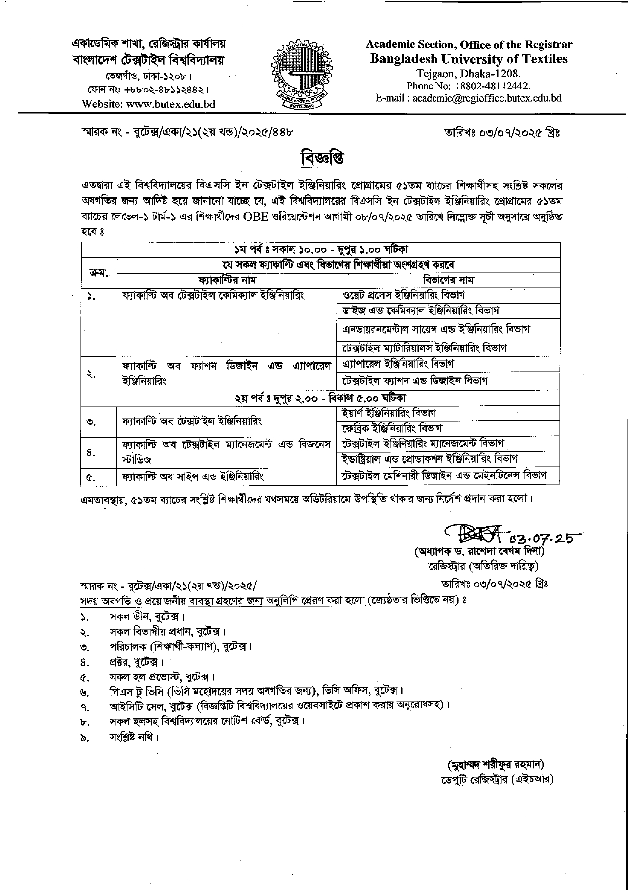 OBE Orientation Program of 51st Batch of BSc in Textile Engineering Will be Held on 8 July, 2025