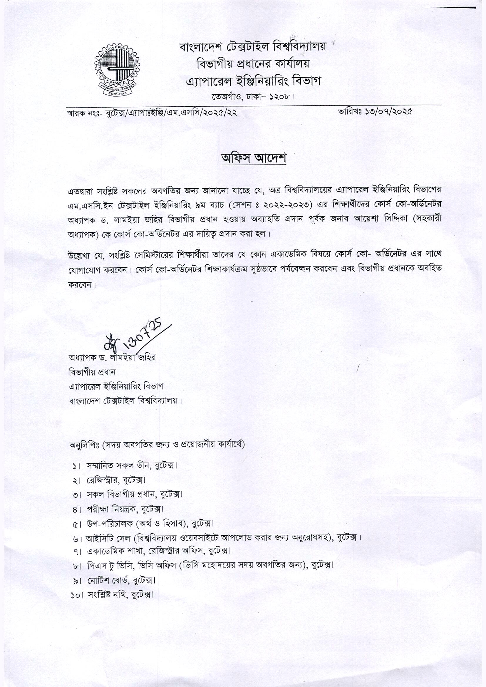 3rd Call Notice for Selected & Waiting Candidates of BSc in Textile Engineering Admission Test 2025-26